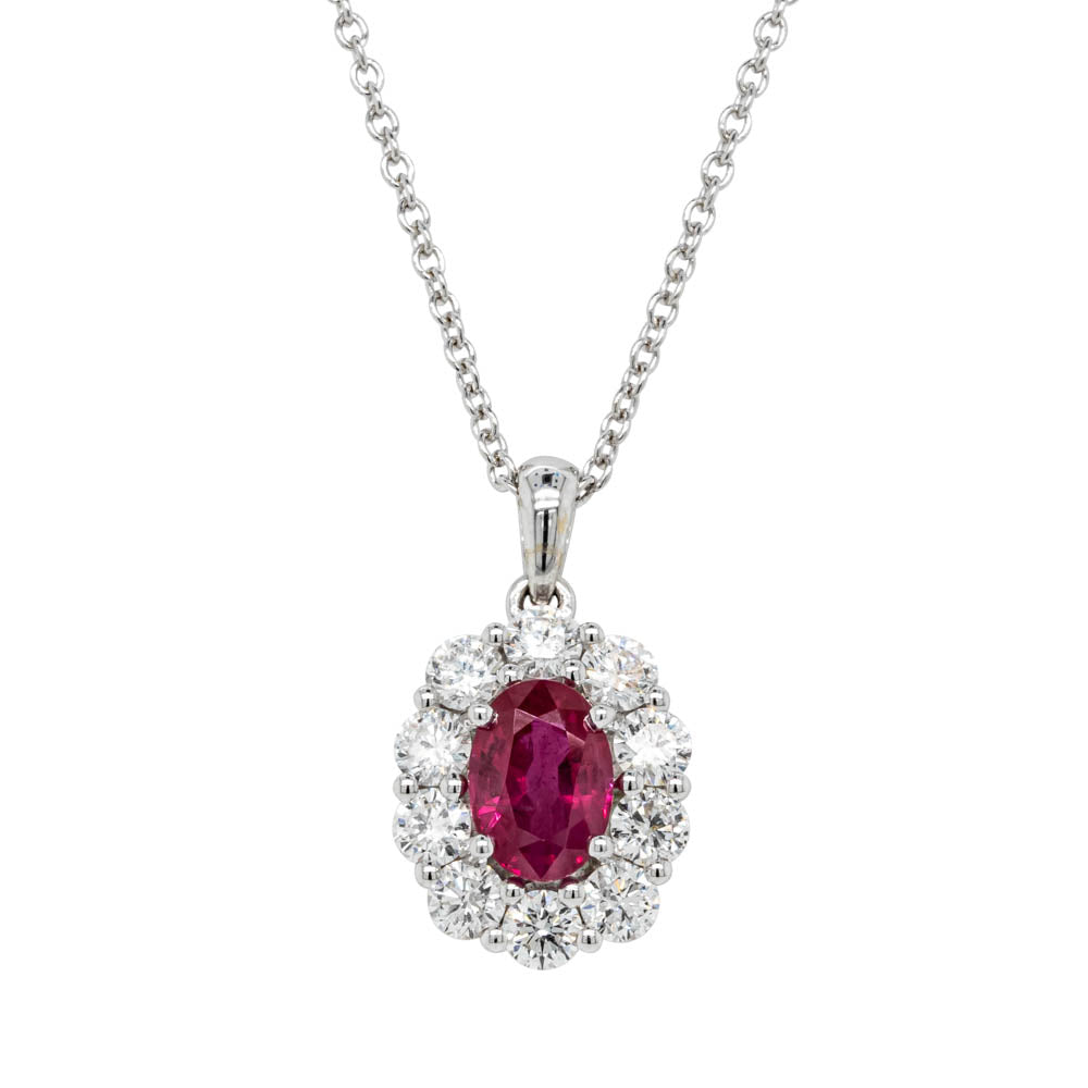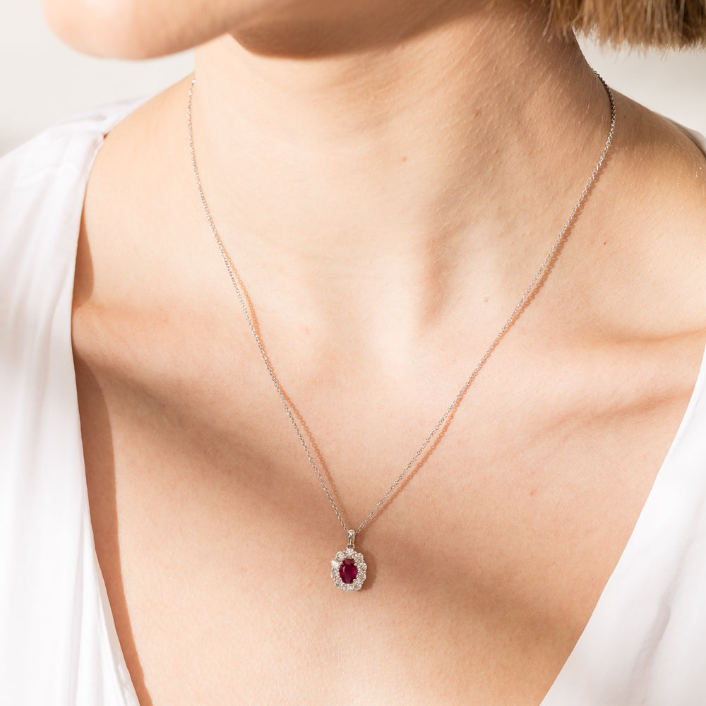 Carefully crafted from divine 18ct white gold, this shimmering piece features an oval faceted ruby resting inside a shimmering diamond halo.
