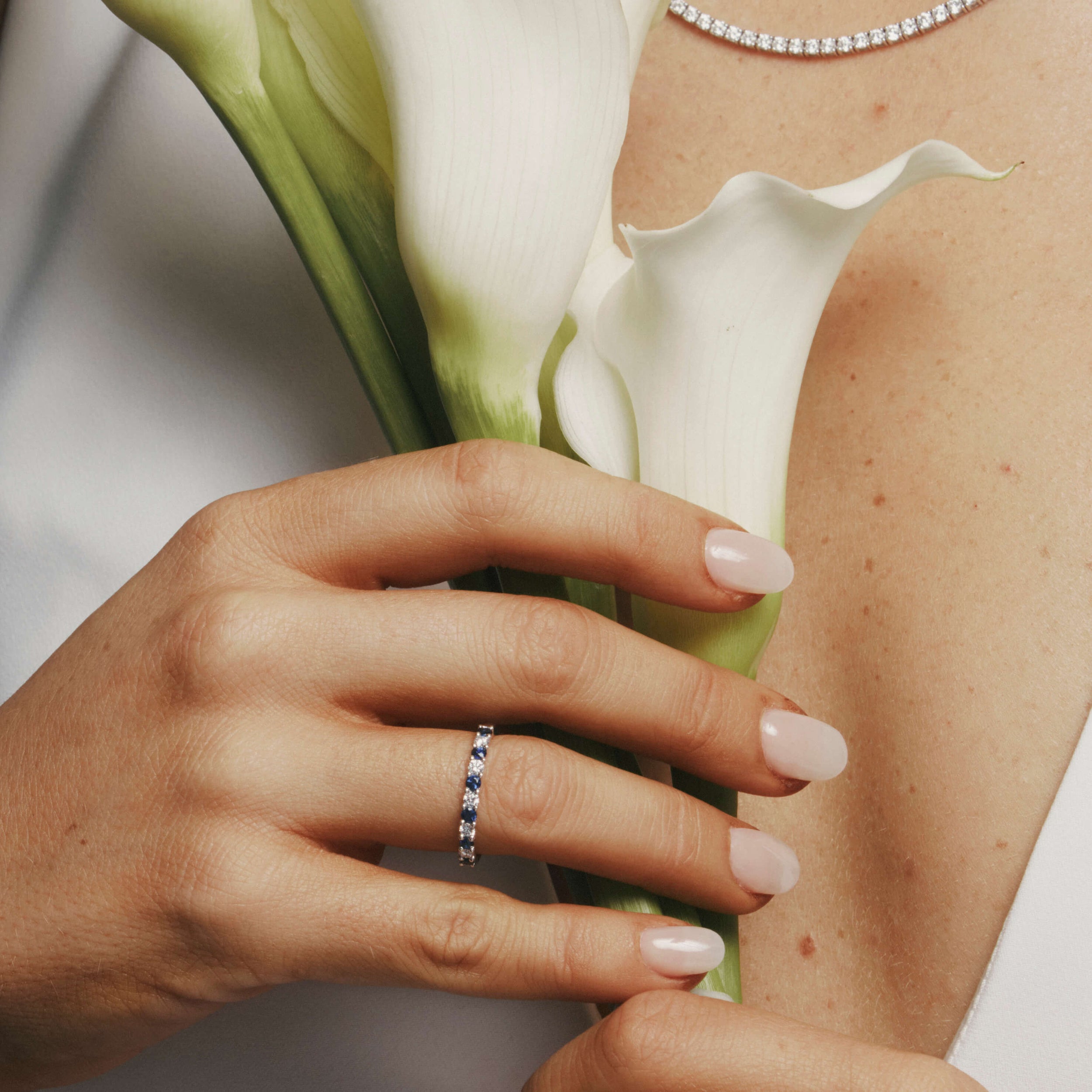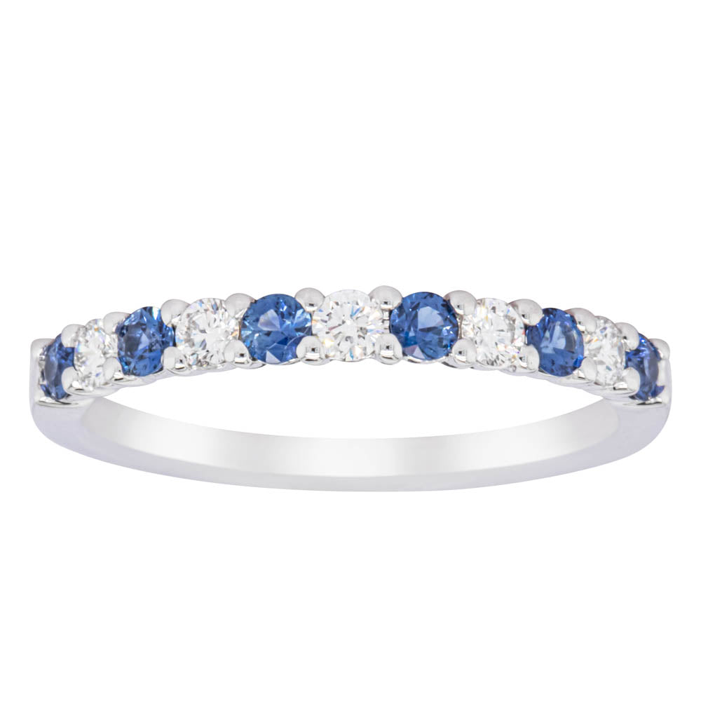 Hand crafted in high palladium 18ct white gold, this beautiful ring boasts dark blue sapphires alternating with round brilliant cut diamonds.