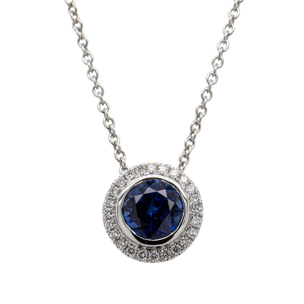 Elegant in every way, this sapphire and diamond pendant features a single round faceted sapphire framed by twenty four bead set round diamonds in our 18ct white gold.