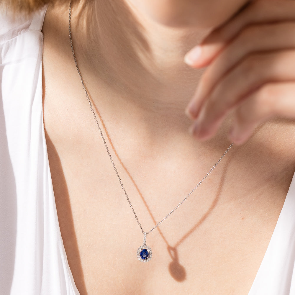 This gorgeous pendant consists of an oval faceted sapphire encased with nineteen round brilliant cut diamonds set in 18ct white gold.