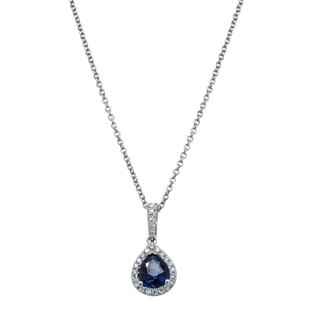 This gorgeous pendant consists of a pear faceted sapphire surrounded by a halo of round brilliant cut diamonds and resting below a tapering diamond set bail, set in 18ct white gold.
