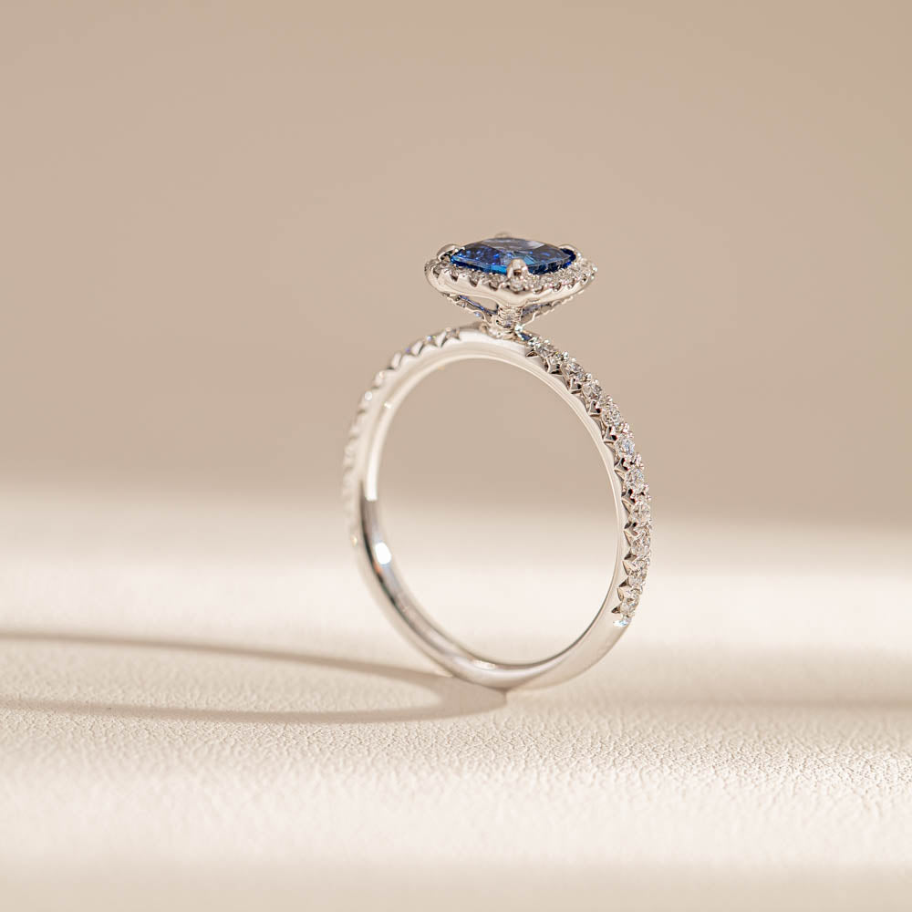 Surrounded by a framing halo of round brilliant cut diamonds, the deep blue colour of the cushion faceted sapphire comes on strong, and delivers the constant companionship of brilliant sparkle. This statement ring is set in our high palladium 18ct 1899 white gold.