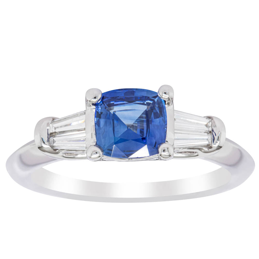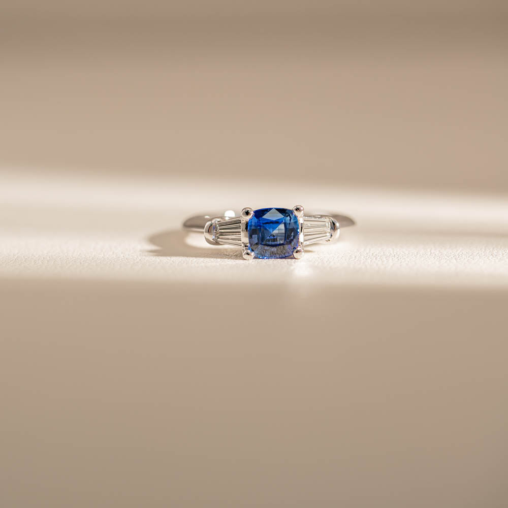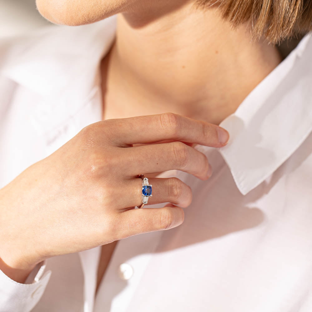 Surrounded by four taper cut diamonds, the deep blue colour of the cushion faceted sapphire comes on strong, and delivers the constant companionship of brilliant sparkle. This statement ring is set in our high palladium 18ct 1899 white gold.