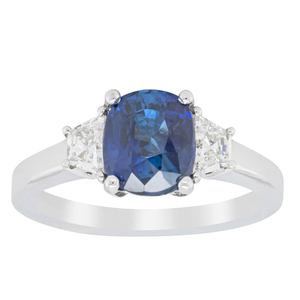 A superb, elongated cushion cut sapphire is perfectly complemented by radiant cut trapezoid shoulder diamonds. Supporting the stunning blue shimmer of the Ceylonese sapphire, discrete diamond detailing on the side profile adds further intrigue.