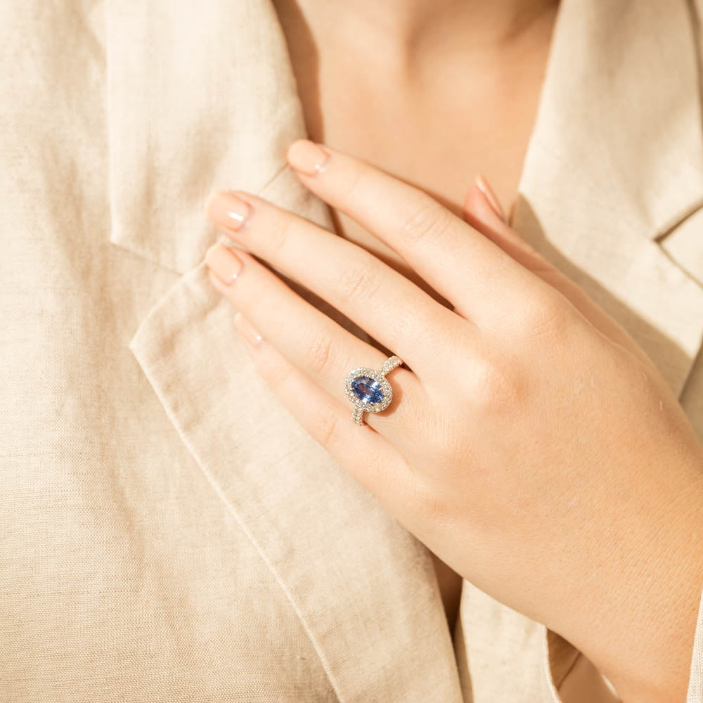 Boasting an oval faceted sapphire and a diamond halo you will be the definition of beauty and elegance in this ring from our signature 1899 collection, beautifully set in 18ct white gold.