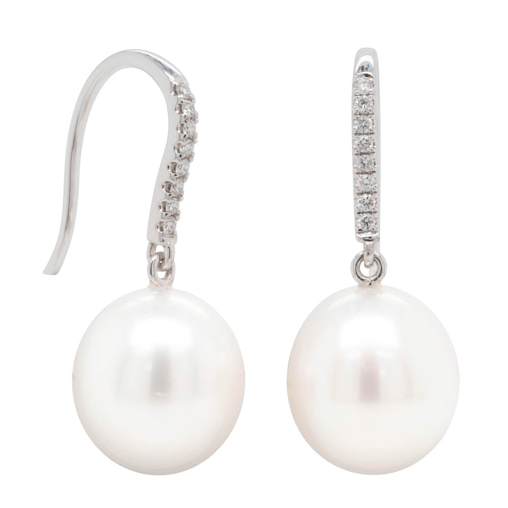 These stunning South Sea pearl earrings are carefully crafted in 18ct white gold from our signature 1899 collection. It consists of a peg set pearl swinging on a diamond set hook.