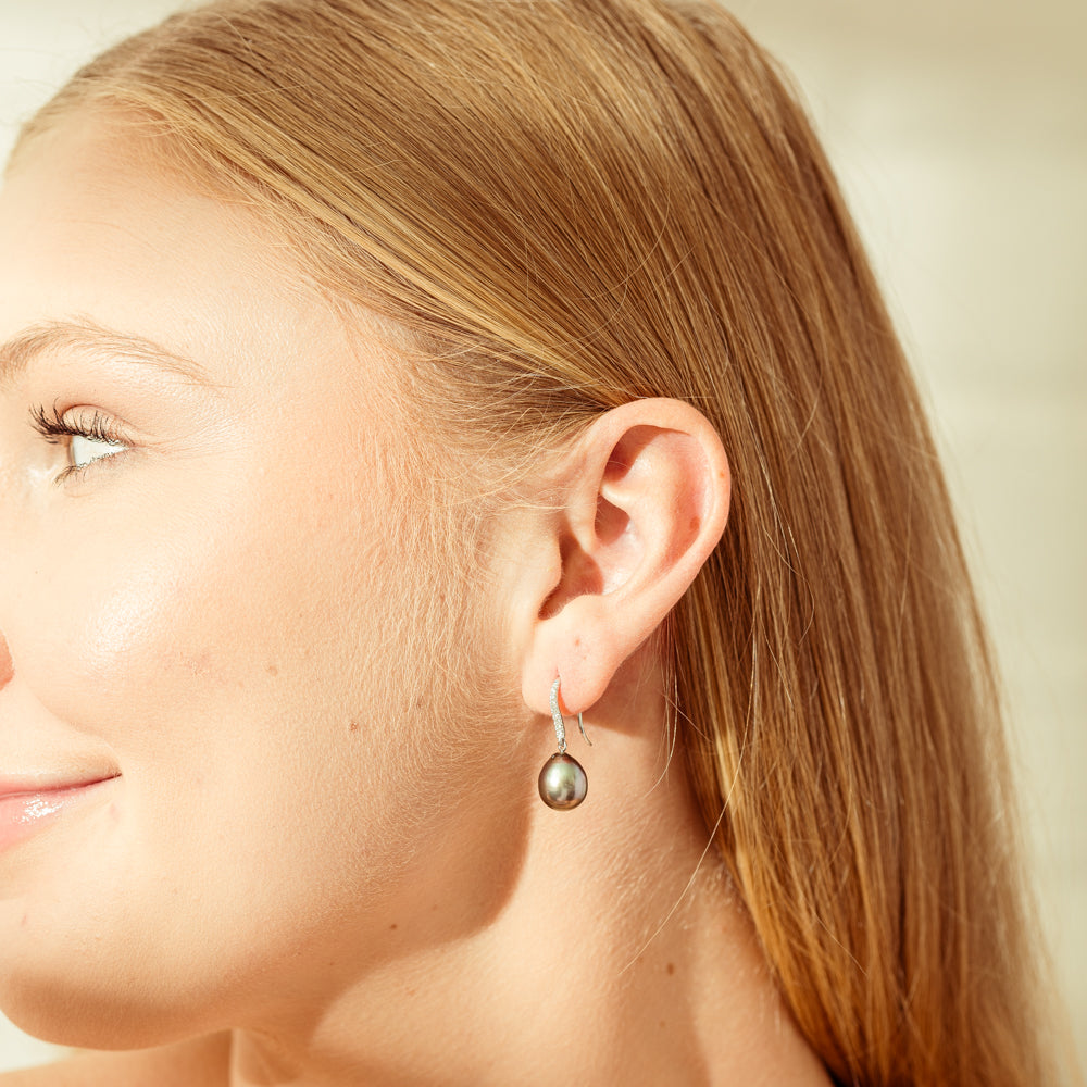 18ct White Gold Tahitian Black 10mm Pearl & Diamond Drop Earrings