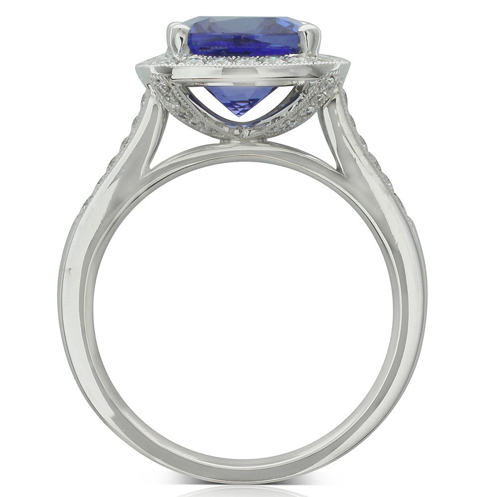 Tantalising tanzanite... This beautiful ring is set in 18ct white gold and boasts a violet blue cushion cut tanzanite, surrounded by a glittering diamond halo and shoulders. Wow her with this impressive ring!