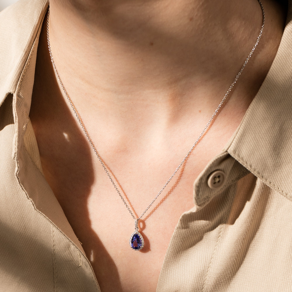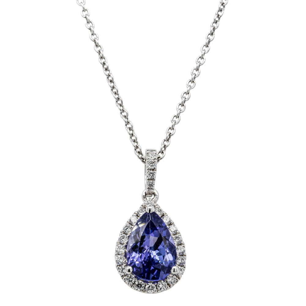 18ct white gold pendant from our signature 1899 collection boasts one pear faceted tanzanite framed by a halo of diamonds and a diamond set bail.