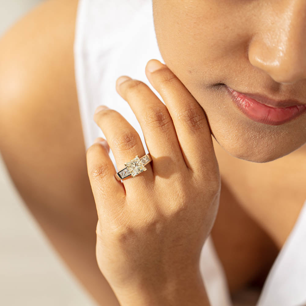 Princess cut diamonds are the next “in” cut, destined to enjoy a new wave of admirers. With facet structure reminiscent of a kaleidoscope, it is easy to become captivated by the dreamy pavilion reflections of this central three carat fancy light yellow diamond. Unusually sized princess shoulder stones complete a perfectly balanced minimalist design.
