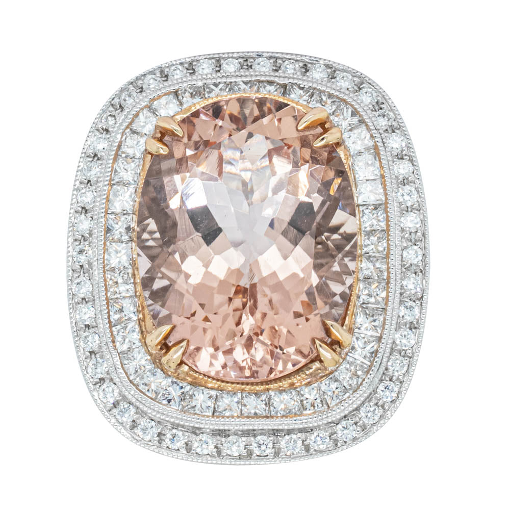 18ct White & Rose Gold Morganite & Diamond Halo Ring