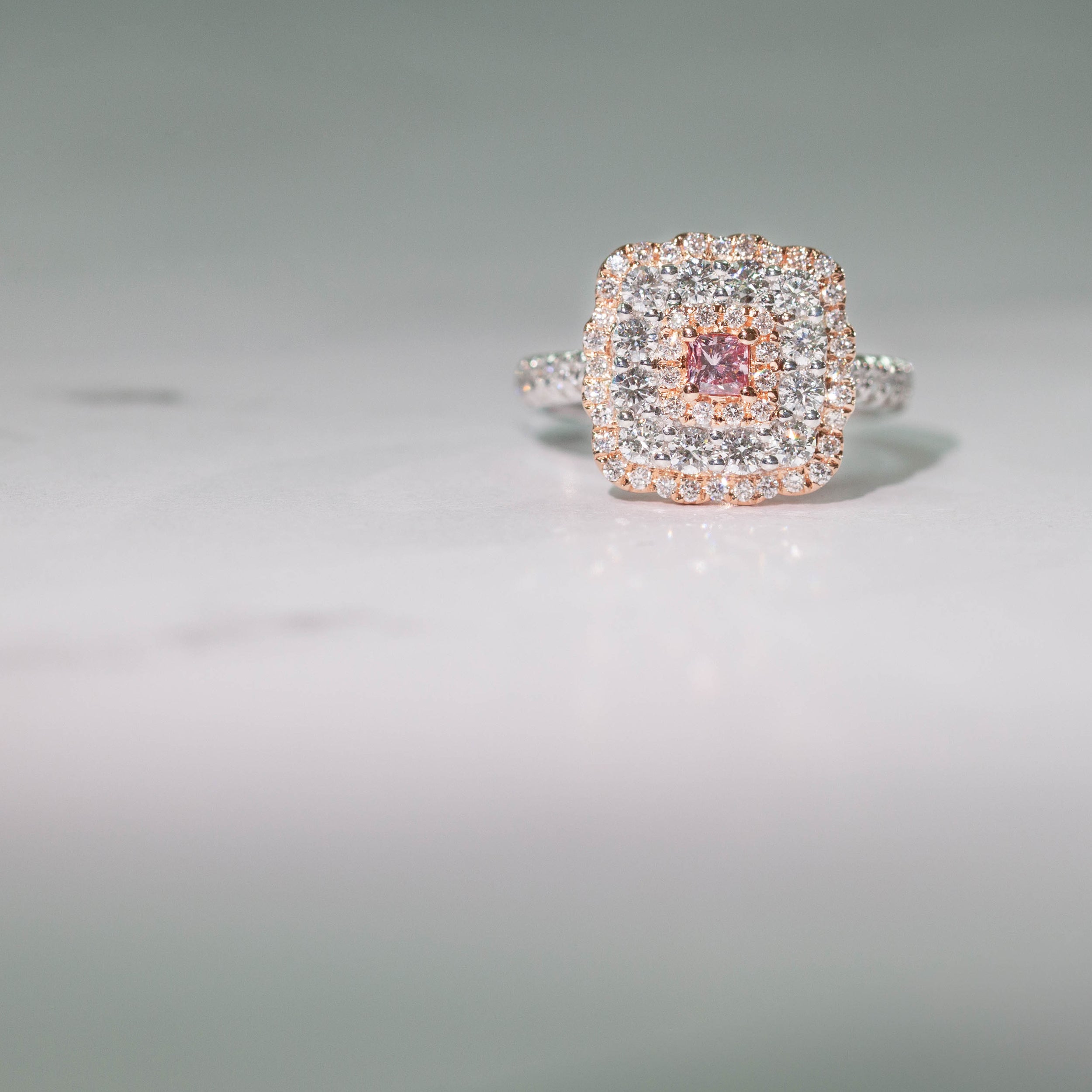 This 18ct white gold Snowflake ring with rose gold setting features one round brilliant cut pink diamond framed by stunning white diamond halos resting on diamond set shoulders.