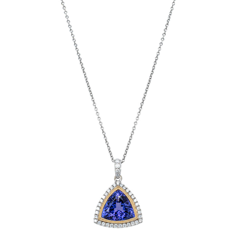 This stunning 18ct white gold pendant boasts one triangular cut strong blue tanzanite and is set in 18ct yellow gold millgrain setting. This striking tanzanite is framed by thirty seven round brilliant cut diamonds.