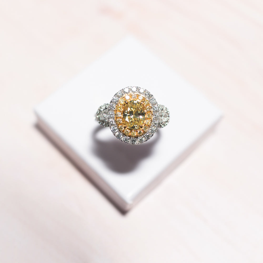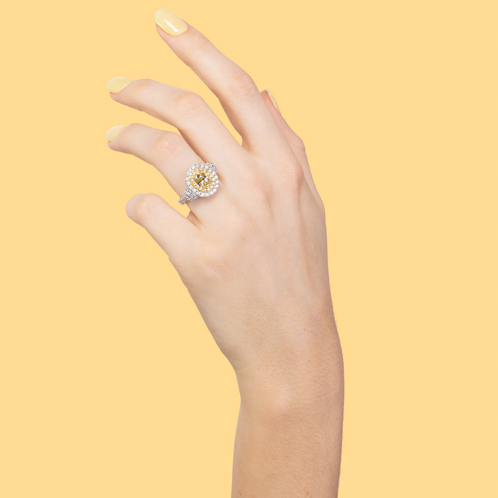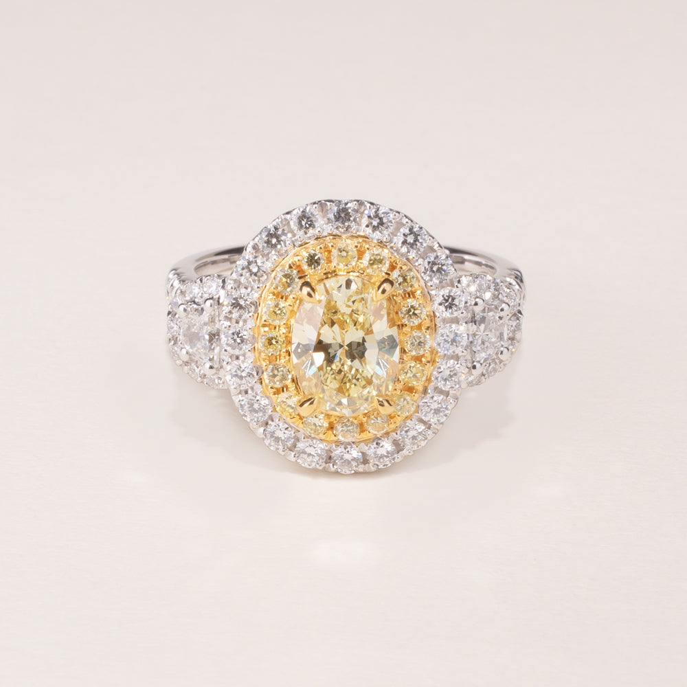 This 18ct white gold Snowflake ring with yellow gold setting features one dazzling oval cut yellow diamond framed by a halo of stunning diamonds, resting on diamond set shoulders.