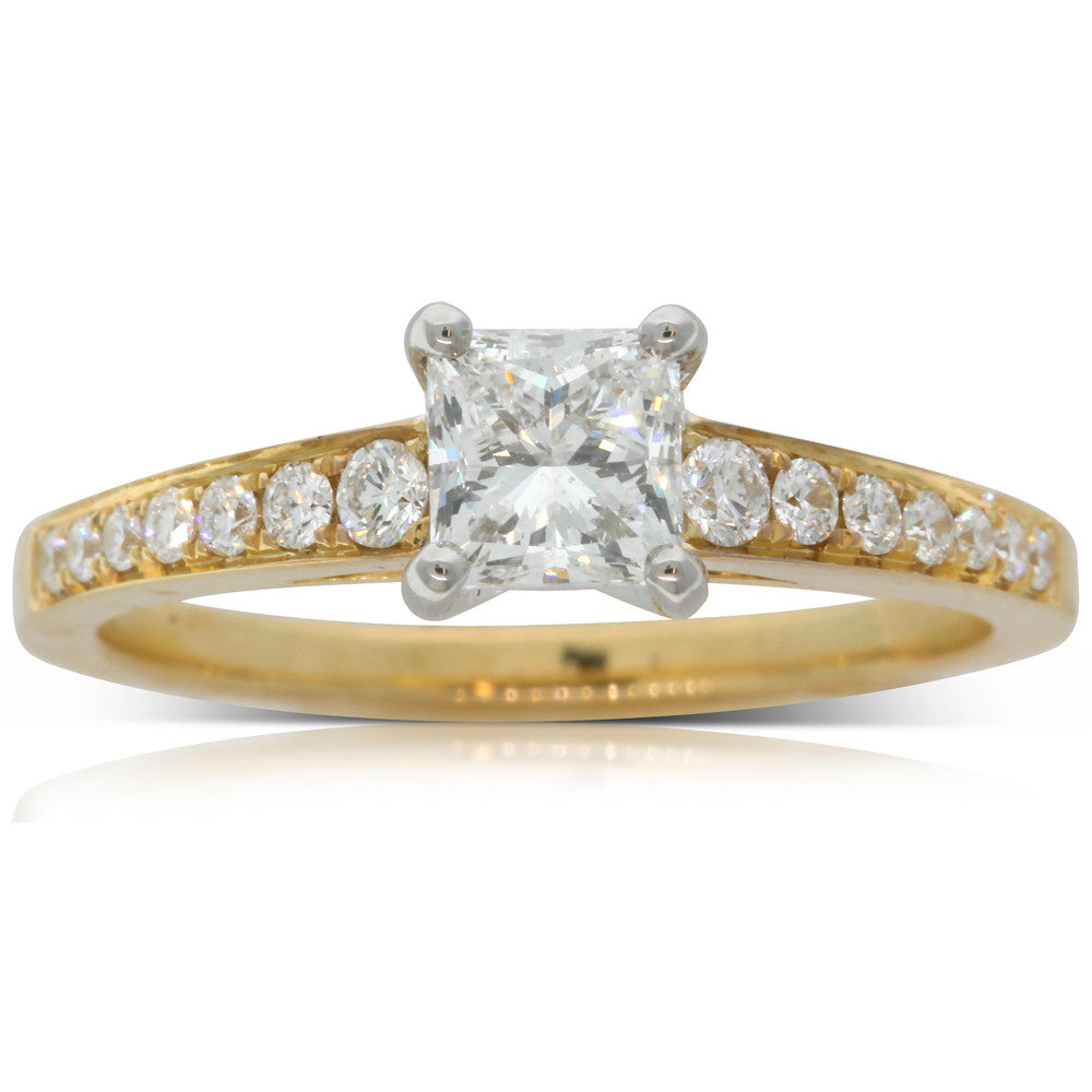 Sweep her off her feet with this elegant diamond ring. This piece has been crafted from 18ct yellow and 18ct white gold, boasting a glittering princess cut centre stone with round brilliant shoulders.