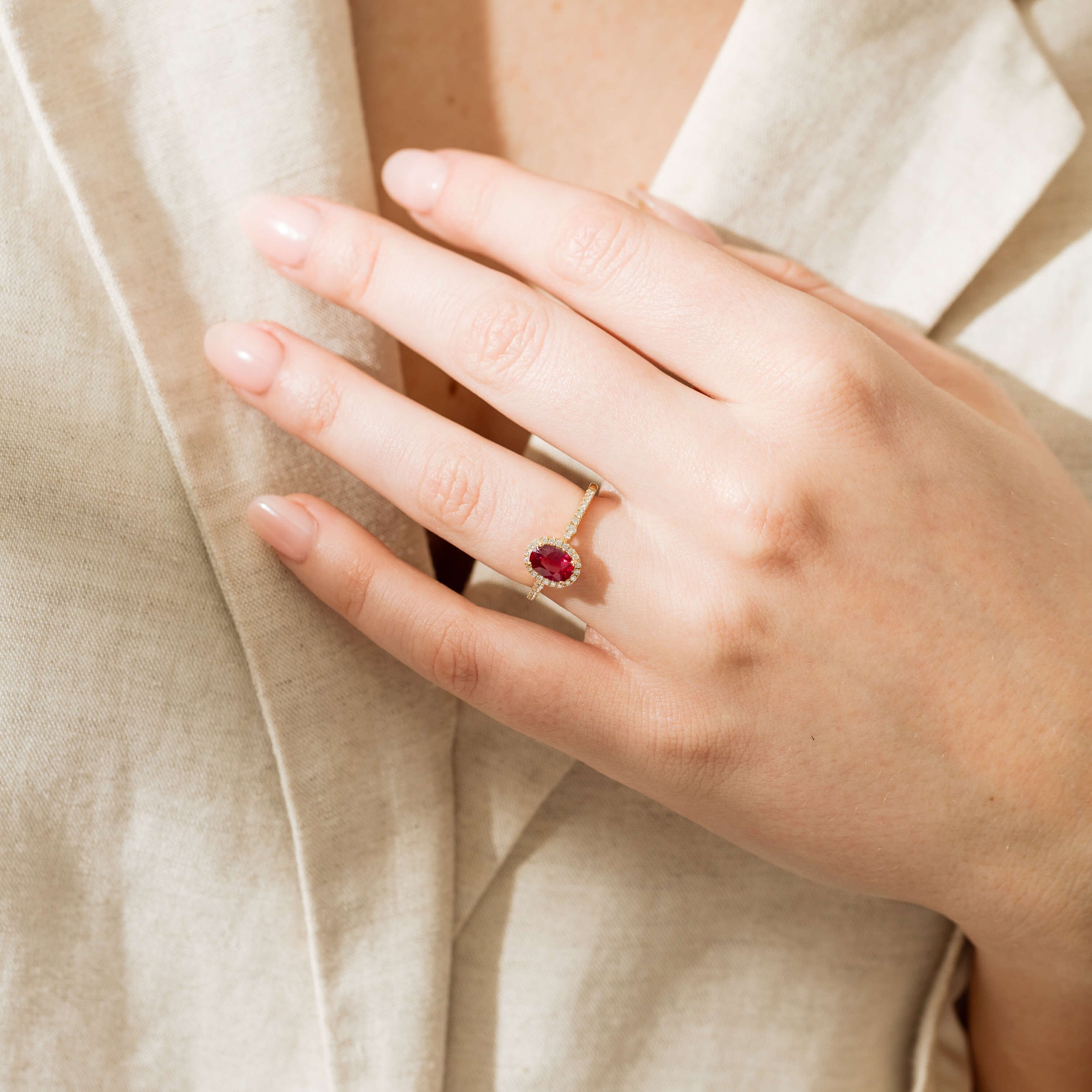 A stunning oval faceted red ruby combines with exceptional diamond sparkle to make a luminous statement in this gorgeous mini Sierra ring from our signature 1899 collection. Beautifully crafted from yellow gold.