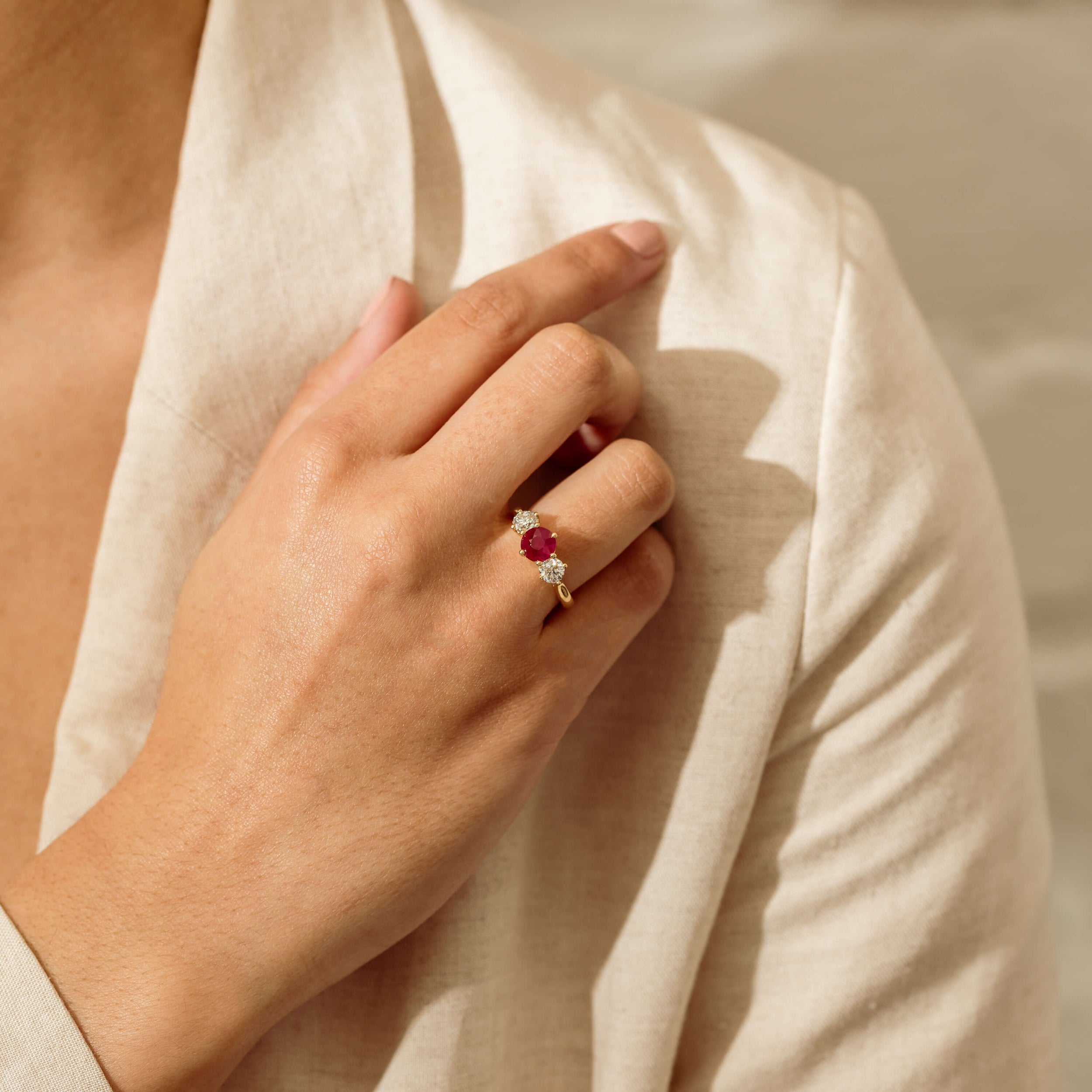 Celebrate your love story with this 18ct Yellow Gold 1.38ct Ruby & Diamond Coronado Ring from our signature 1899 Collection. Spanish for "crowned" - the Coronado design gracefully entwines one round faceted ruby with two round brilliant cut diamonds, each set in ornate crowns of luminous yellow gold, representing the past, present, and future shared together. This romantically regal ring is richly symbolic, with every diamond evoking a cherished moment.