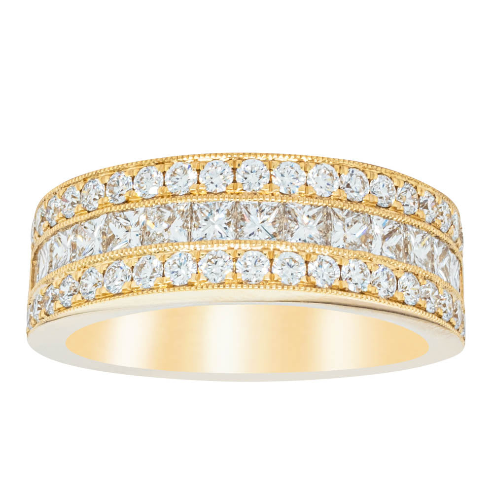 Shower yourself in sparkles! Crafted in 18ct yellow gold, this glittering eternity ring features an array of sparkling princess cut and round brilliant cut diamonds. You will be sure to treasure this precious ring.