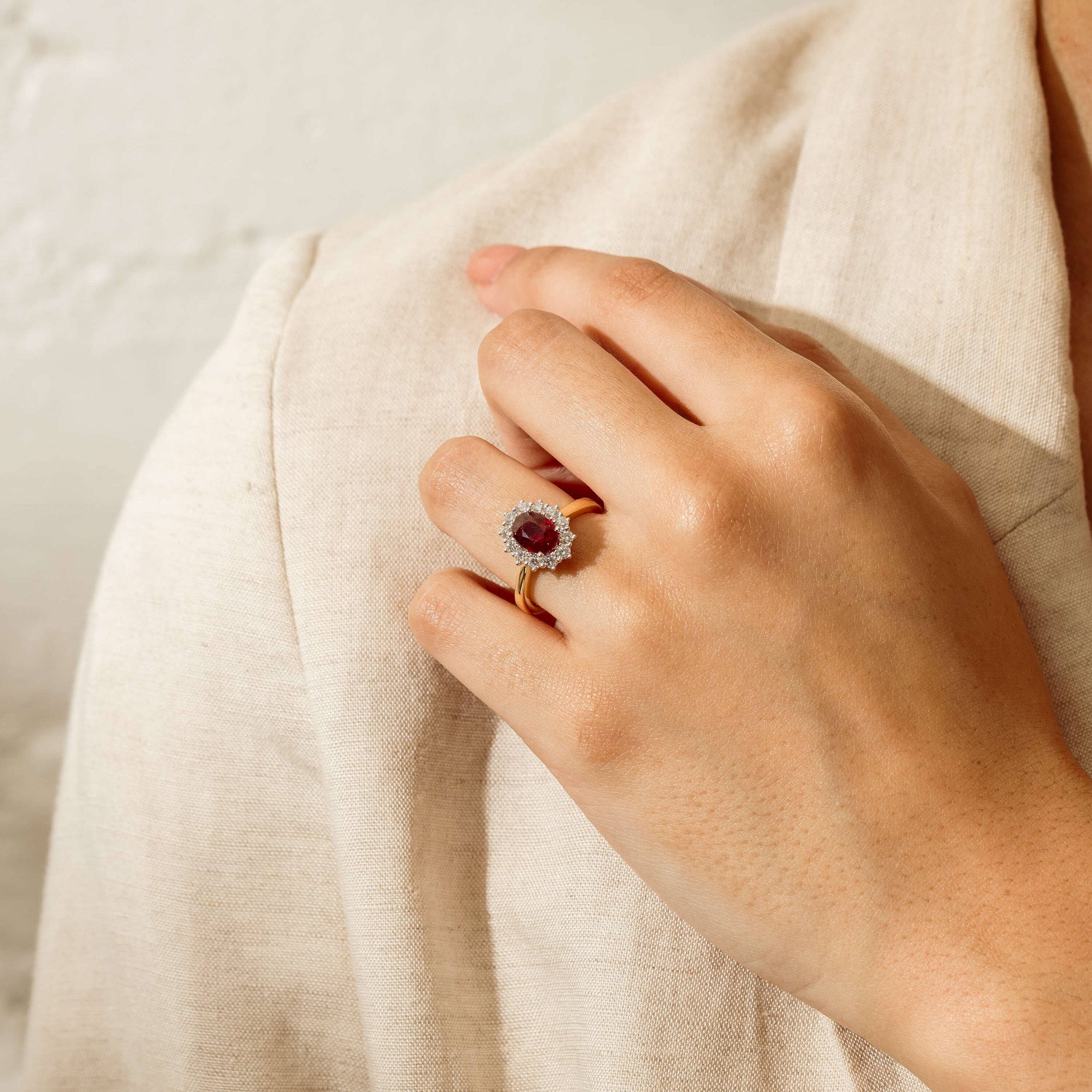 Model wearing Ruby and Diamond Belle Ring