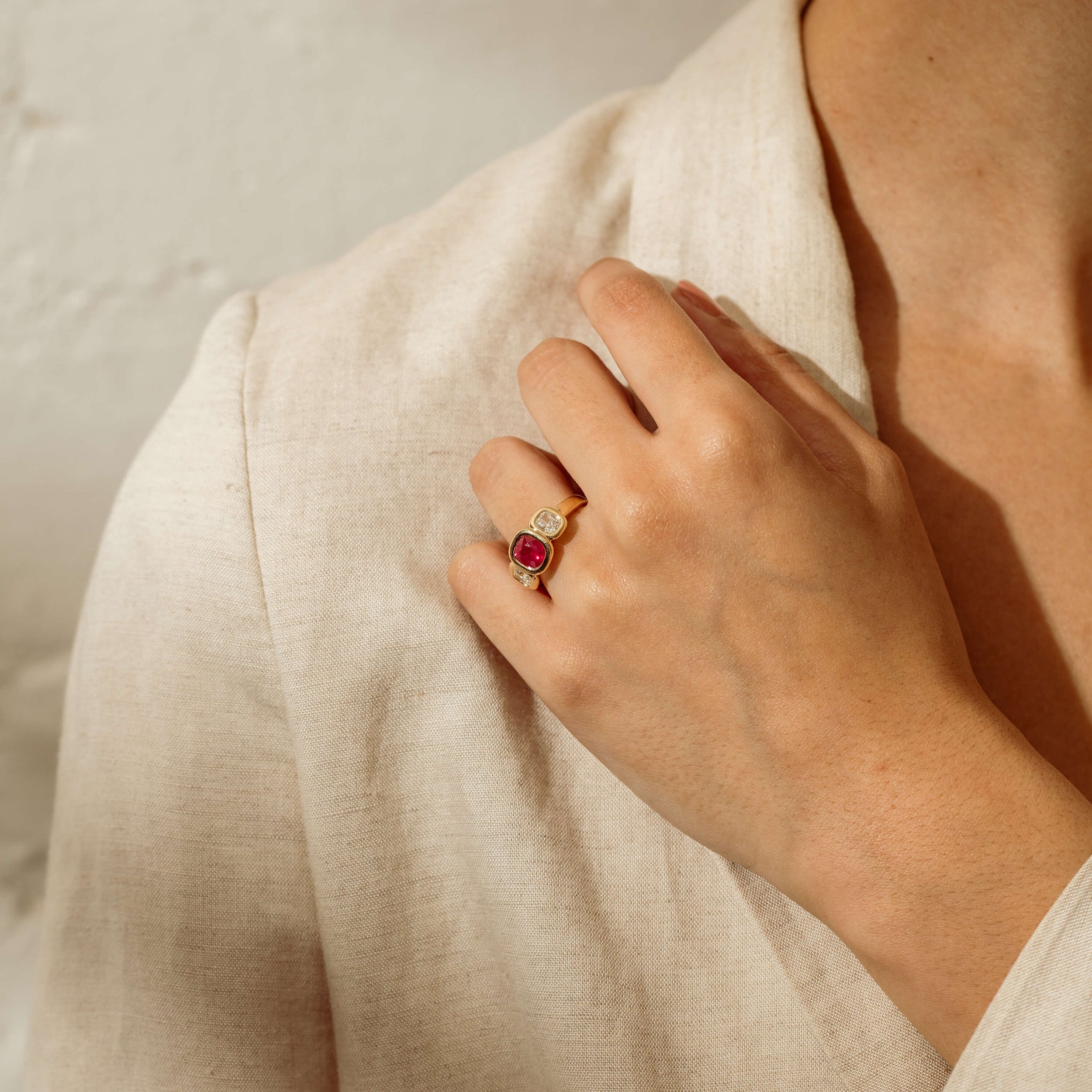 Effortlessly elegant, this precious ruby and diamond Natalia ring is the perfect piece to mark and celebrate a meaningful milestone. Exquisitely crafted in divine 18ct yellow gold from our signature 1899 collection, it showcases an impressive 1.52ct cushion-cut ruby, beautifully framed by two cushion brilliant-cut diamonds.
