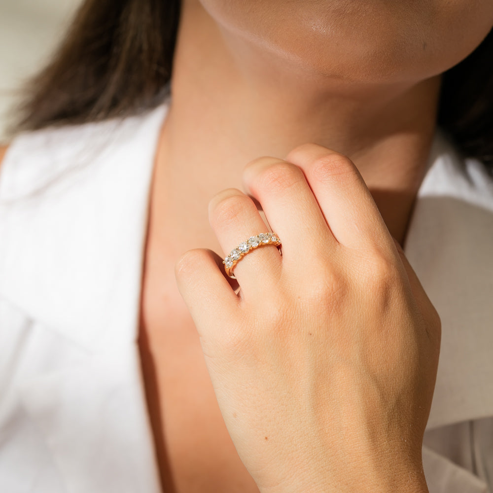 Panorama rings feature a classic prong setting which allows the gemstones to nestle close to another, a perfect reflection of the relationship it represents. Each diamond sits low to allow this style to be worn elegantly next to other rings – an ideal wedding band or stacking ring which is so stunning in its simplicity you will also look forward to letting it shine on its own.