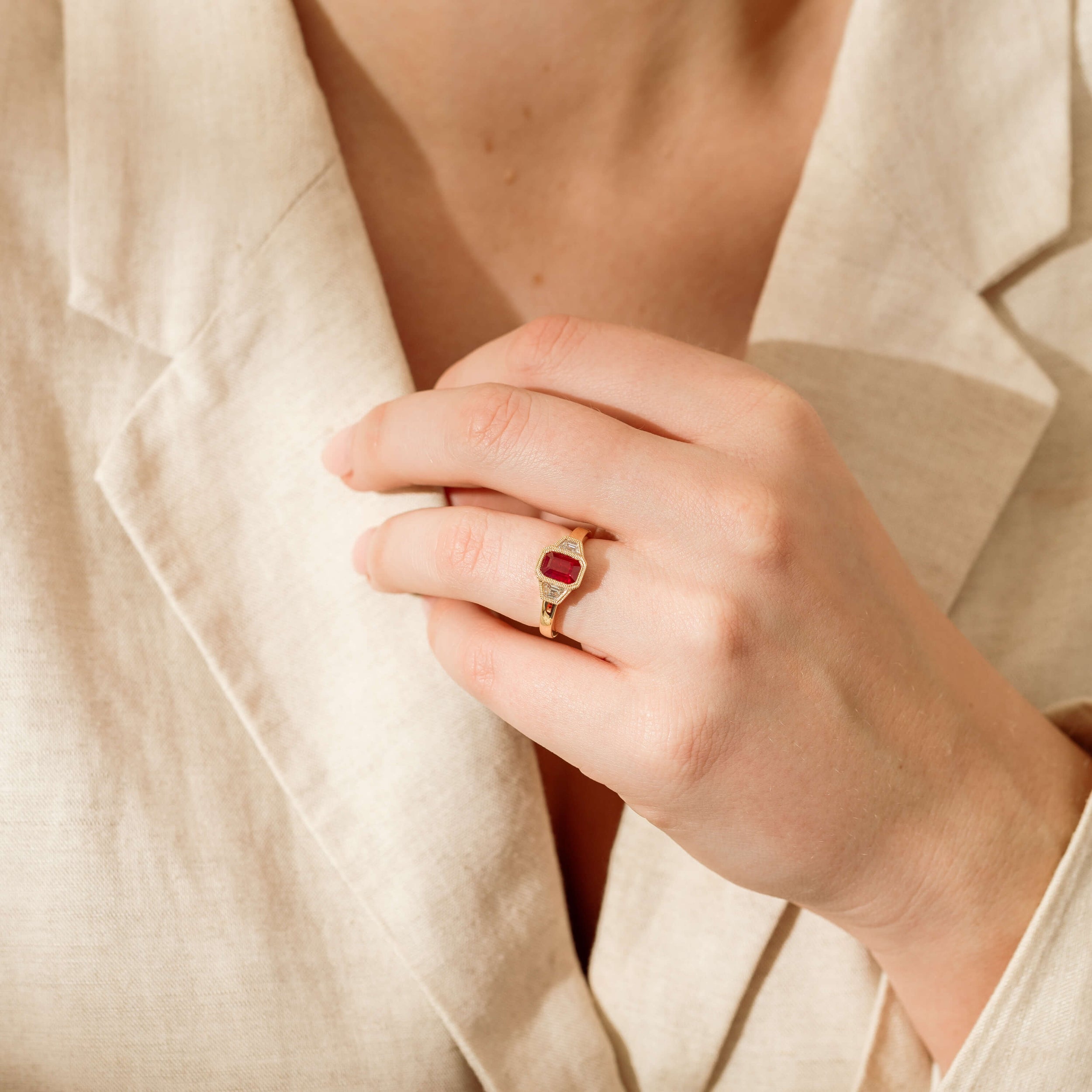 This beautiful ring has been crafted from 18ct yellow gold from our signature 1899 collection, featuring a rectangular step cut ruby from Burma. Completed with two twinkling trapeze cut diamonds.