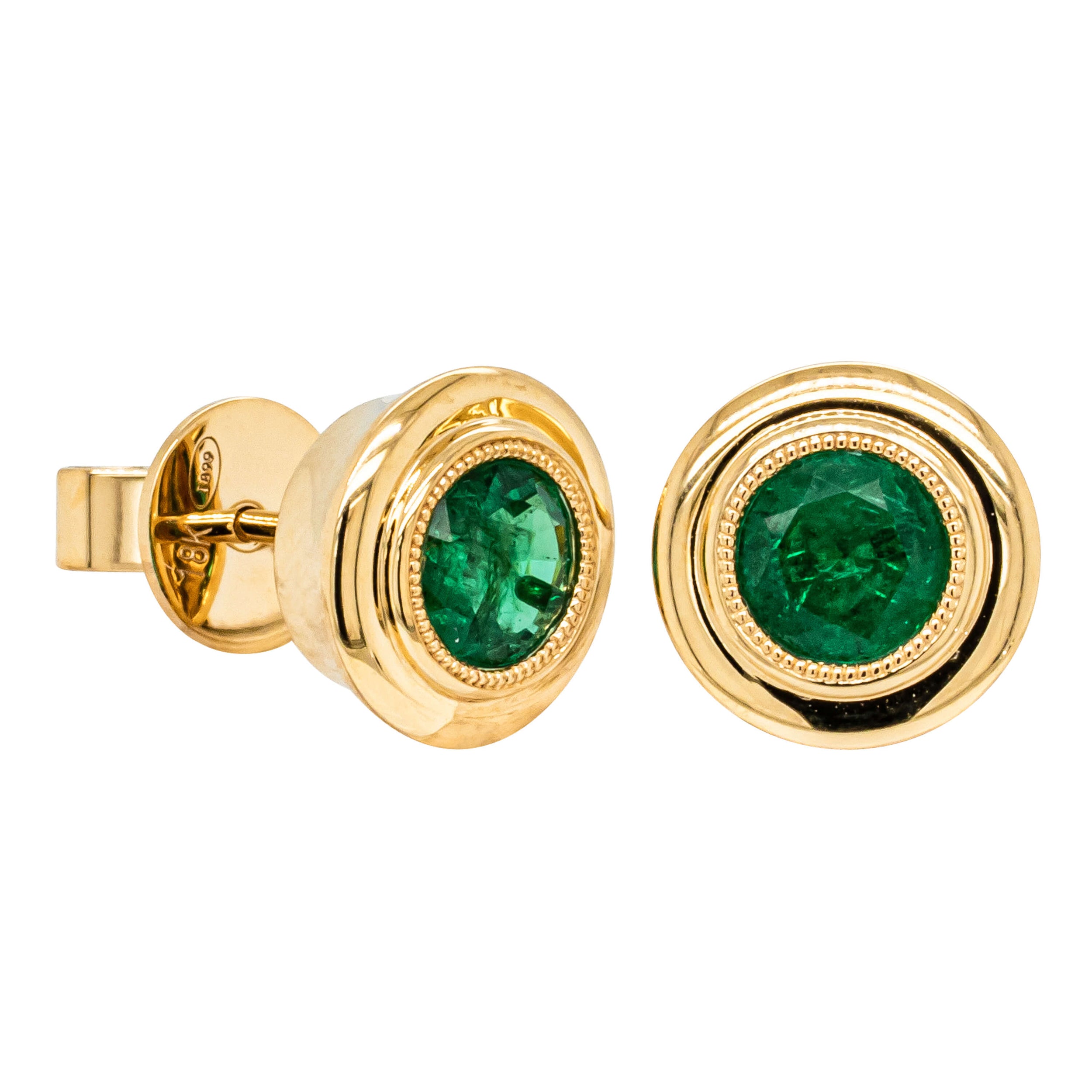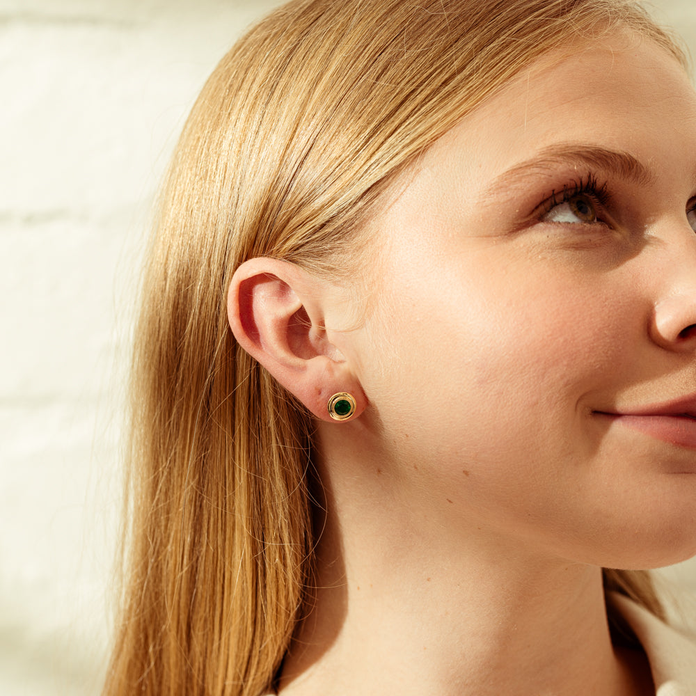 These stunning emerald Windsor earrings feature a rub over setting - the metal embraces the round faceted emerald, securely making Windsor a timeless easy-to-wear style. A vibrant addition to any jewellery collection.