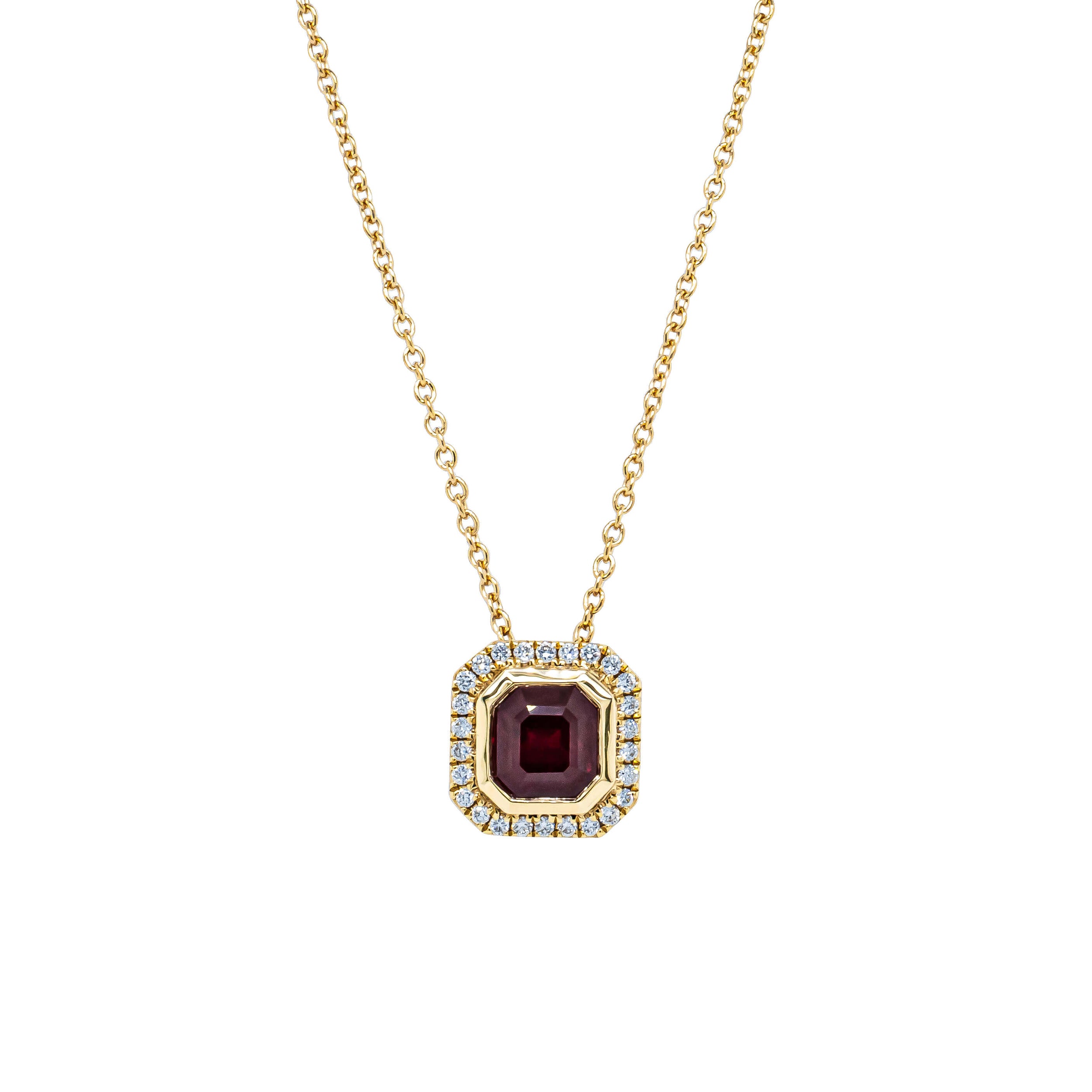 Elegant in every way, this ruby and diamond Isla necklace features a step cut ruby from Burma framed by bead set round diamonds in 18ct yellow gold.