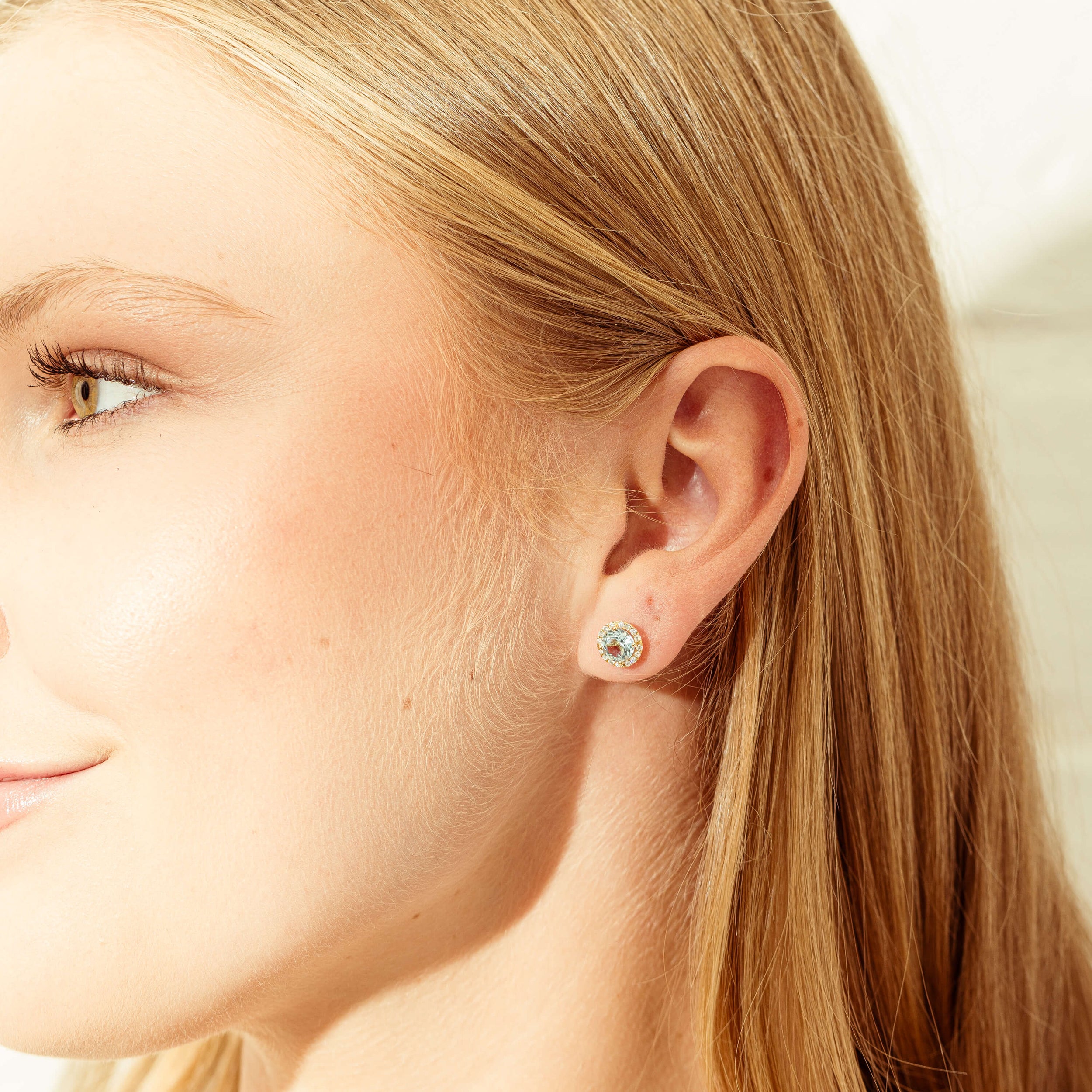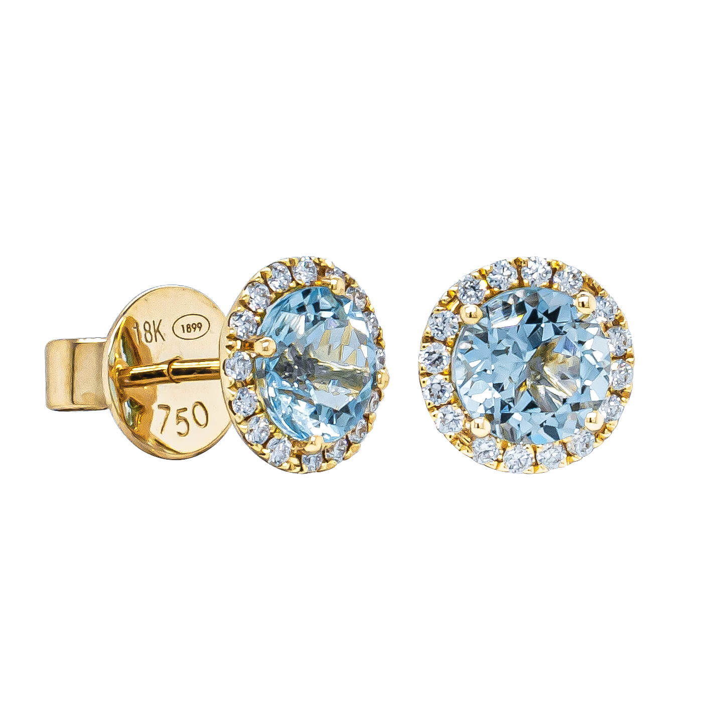 For the one who brings grace and sophistication into every room they enter - our Nina earrings from our signature 1899 collection. The serene hues of these round faceted aquamarines, are brightened by dazzling halos of round brilliant cut diamonds crafted in 18ct yellow gold.