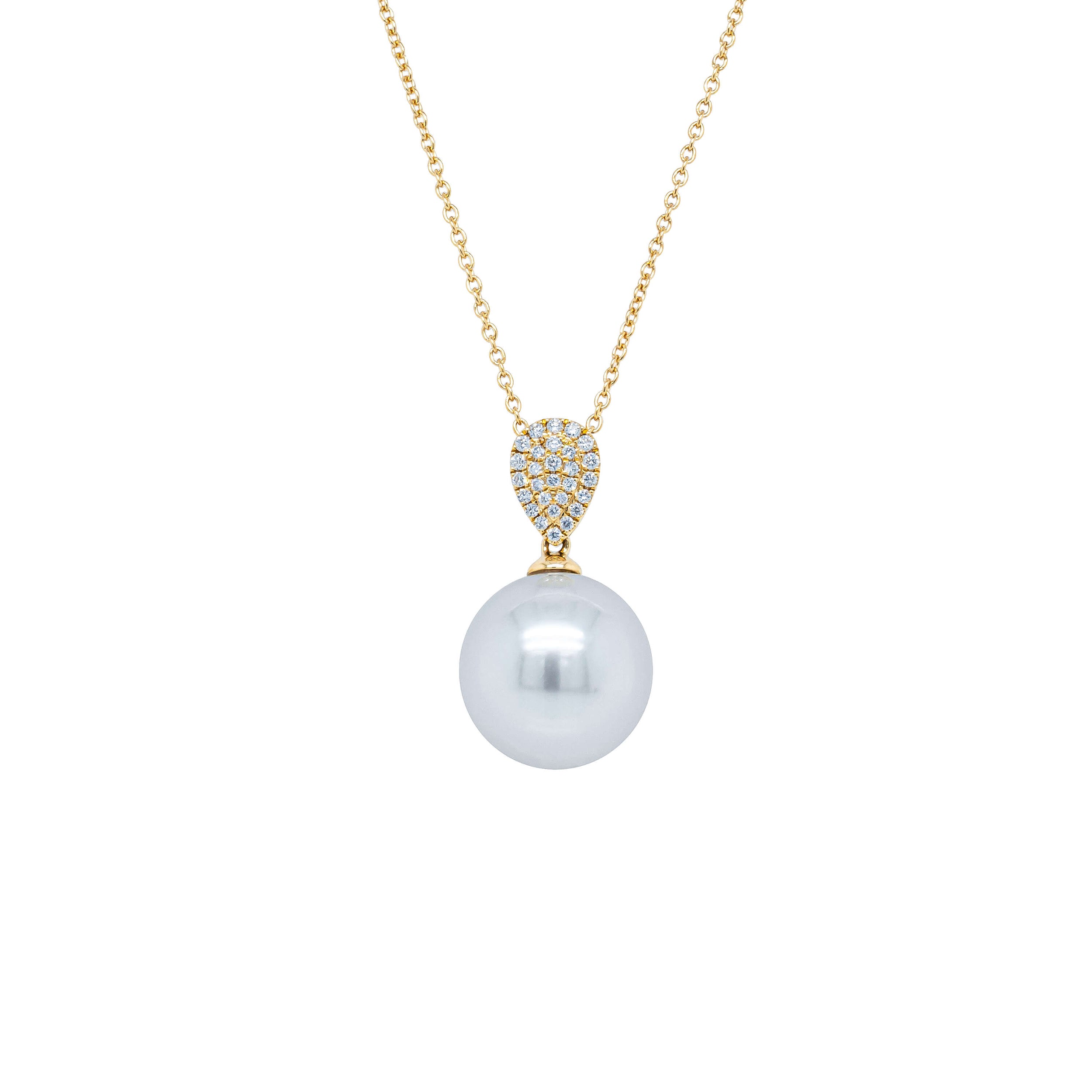 This elegant necklace features a stunning South Sea pearl. Set in luxurious 18ct yellow gold from our signature 1899 collection, this luminous pearl swings beneath a diamond set, pear shaped mount.