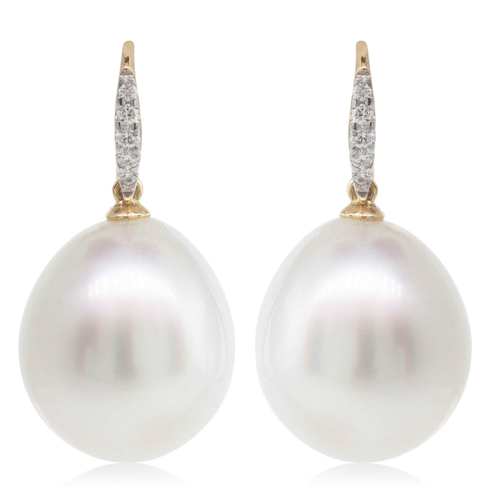Spoil her with this adorable pair of pearl and diamond earrings. Crafted carefully in 18ct yellow gold this pair features two luxurious peg set south sea pearls which swing from shimmering diamond set hooks! A vision of elegance, this pair is sure to put a sparkle in her step.