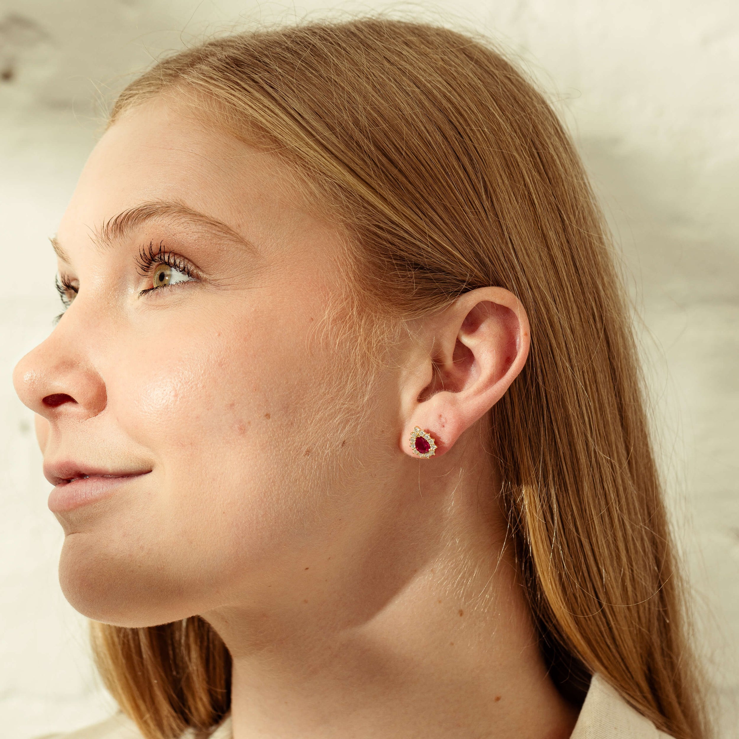 Simply mesmerising.. these vibrant ruby & diamond studs from our Belle collection will have her falling in love! Carefully set in shining 18ct yellow gold, this precious pair boast two pear faceted rubies from Burma framed by a dazzling round brilliant cut diamond halo. She will think of you whenever she wears them!