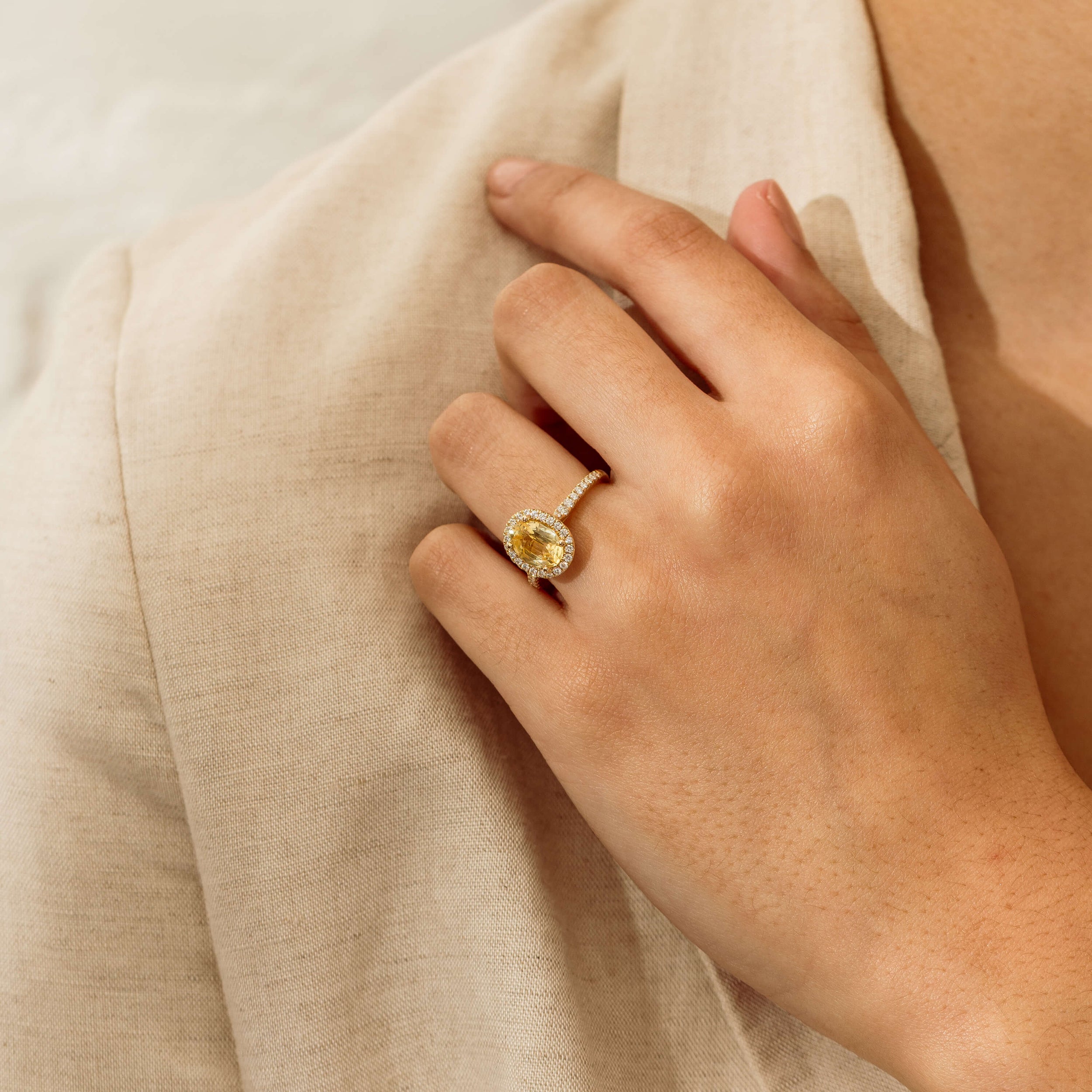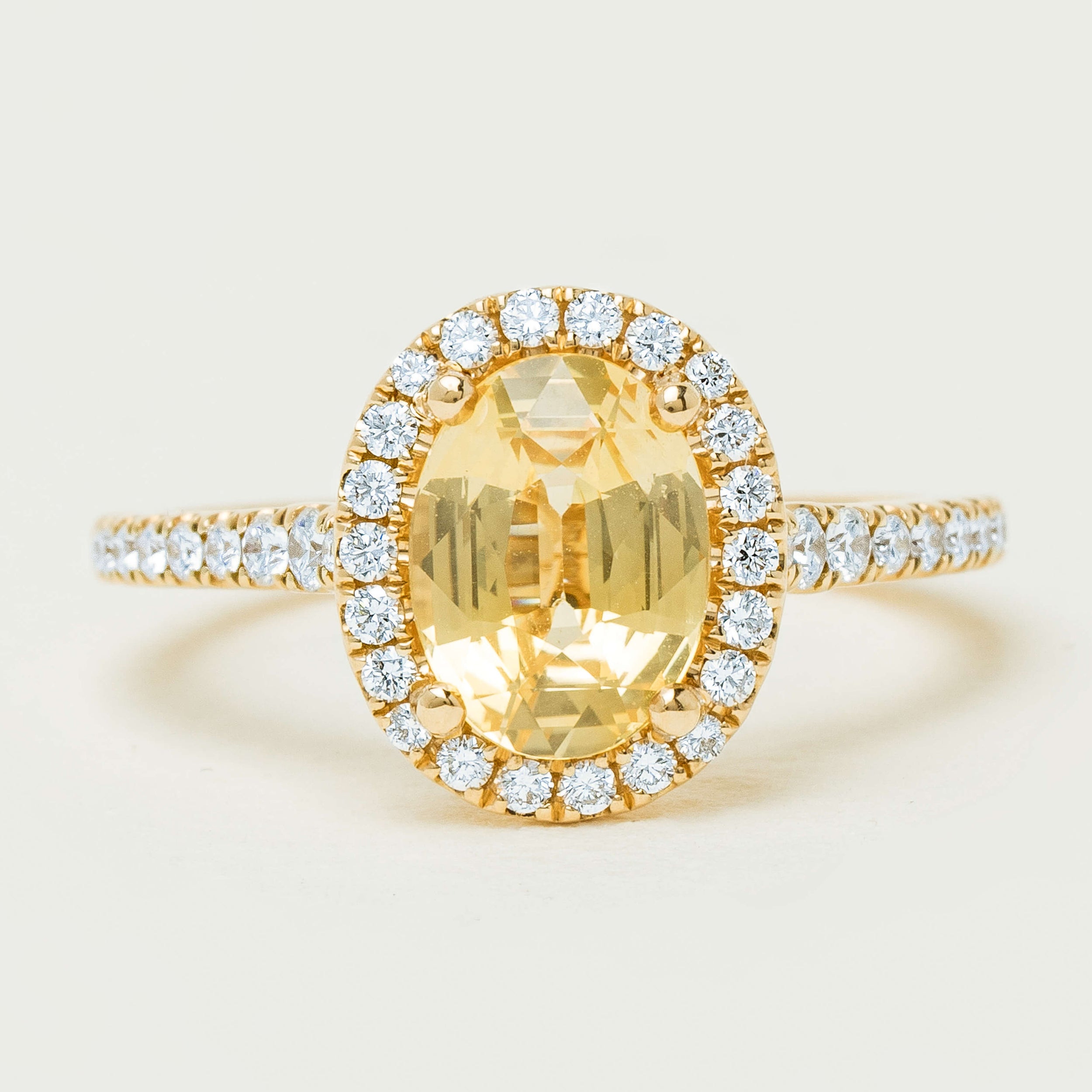 View BagThis exquisite Sierra ring from our signature 1899 collection radiates timeless luxury and modern elegance. At its heart is a breathtaking 2.10ct oval-cut golden sapphire, prized for its exceptionally vibrant and lively hue. The sapphire’s luminous colour captures and reflects light, creating a warm, inviting glow with every movement. Surrounding the central gemstone is a dazzling halo of meticulously set brilliant diamonds, designed to amplify the sapphire’s natural brilliance while adding a layer of refined sparkle. The band, gracefully accented with additional diamonds, ensures that every angle of the ring glistens with sophistication. Crafted in lustrous 18ct yellow gold, this piece seamlessly blends classic charm with contemporary allure.