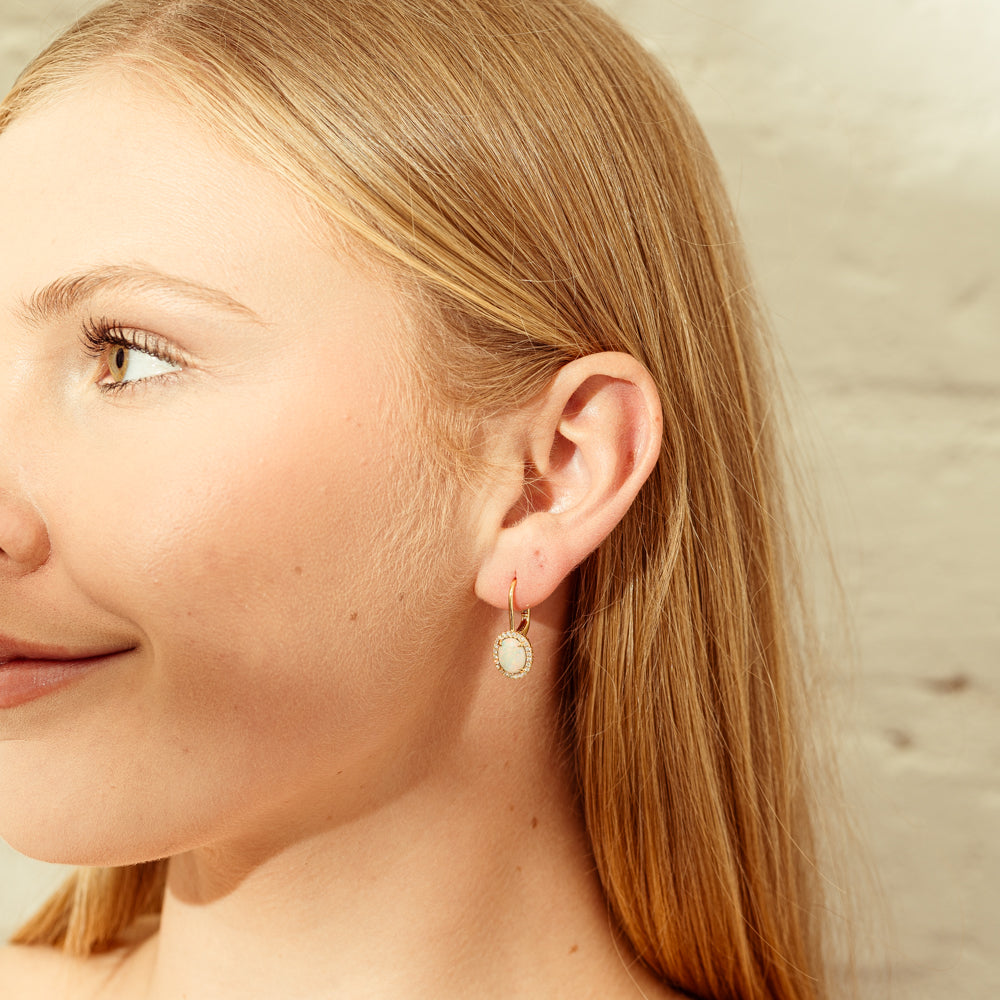 View BagThe oval cabochon white opals framed by round brilliant cut diamonds make a luminous statement in these gorgeous Sierra earrings from our signature 1899 collection. The opals are a white colour with a play of orange and green. They are secured on hooked earwires with hinged keepers.