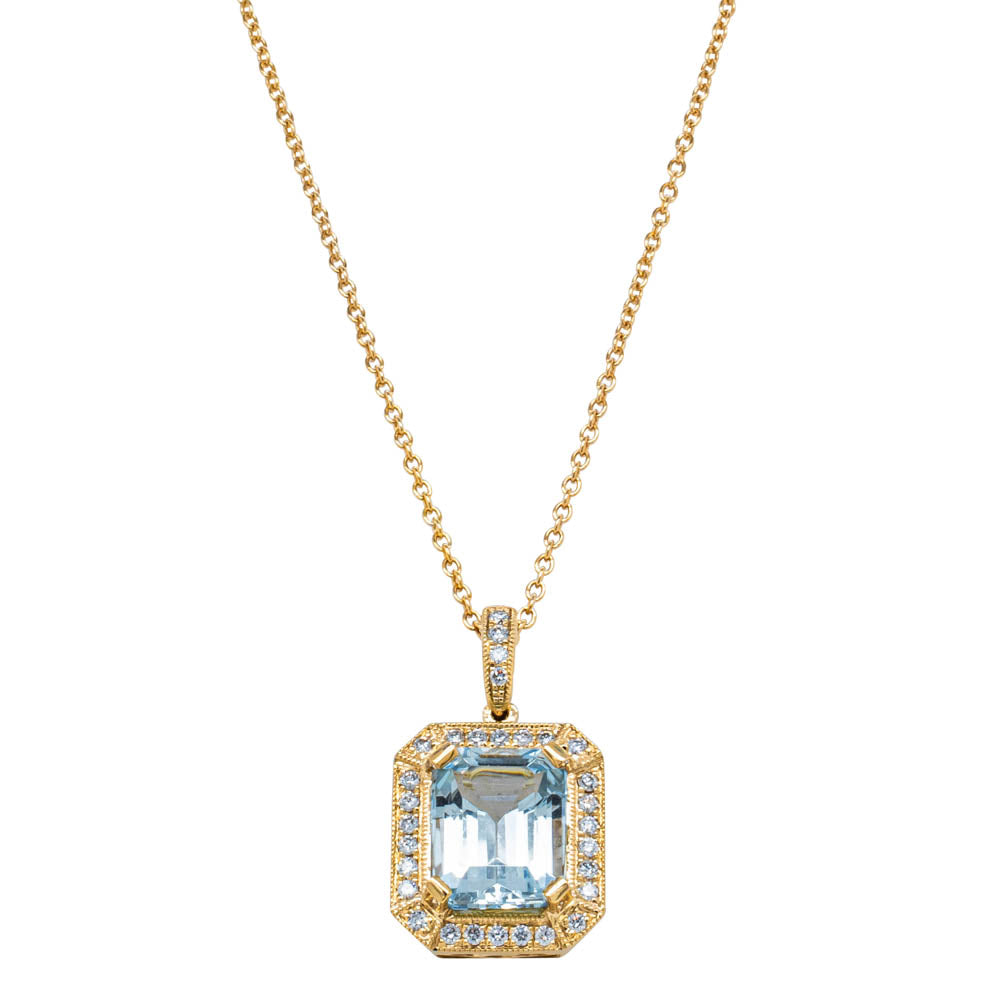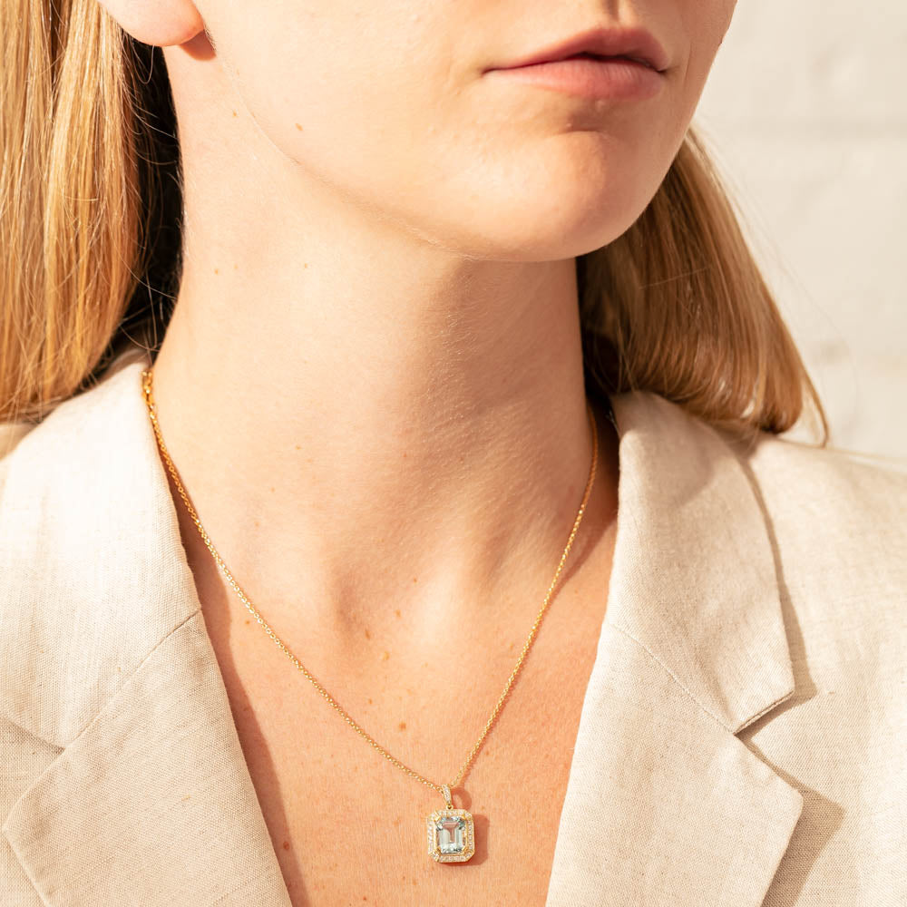 Exquisite and royal in every sense, this 18ct Yellow gold Empire pendant from our signature 1899 collection boasts one rectangular cut aquamarine, framed by a halo of white diamonds and diamond set bail.