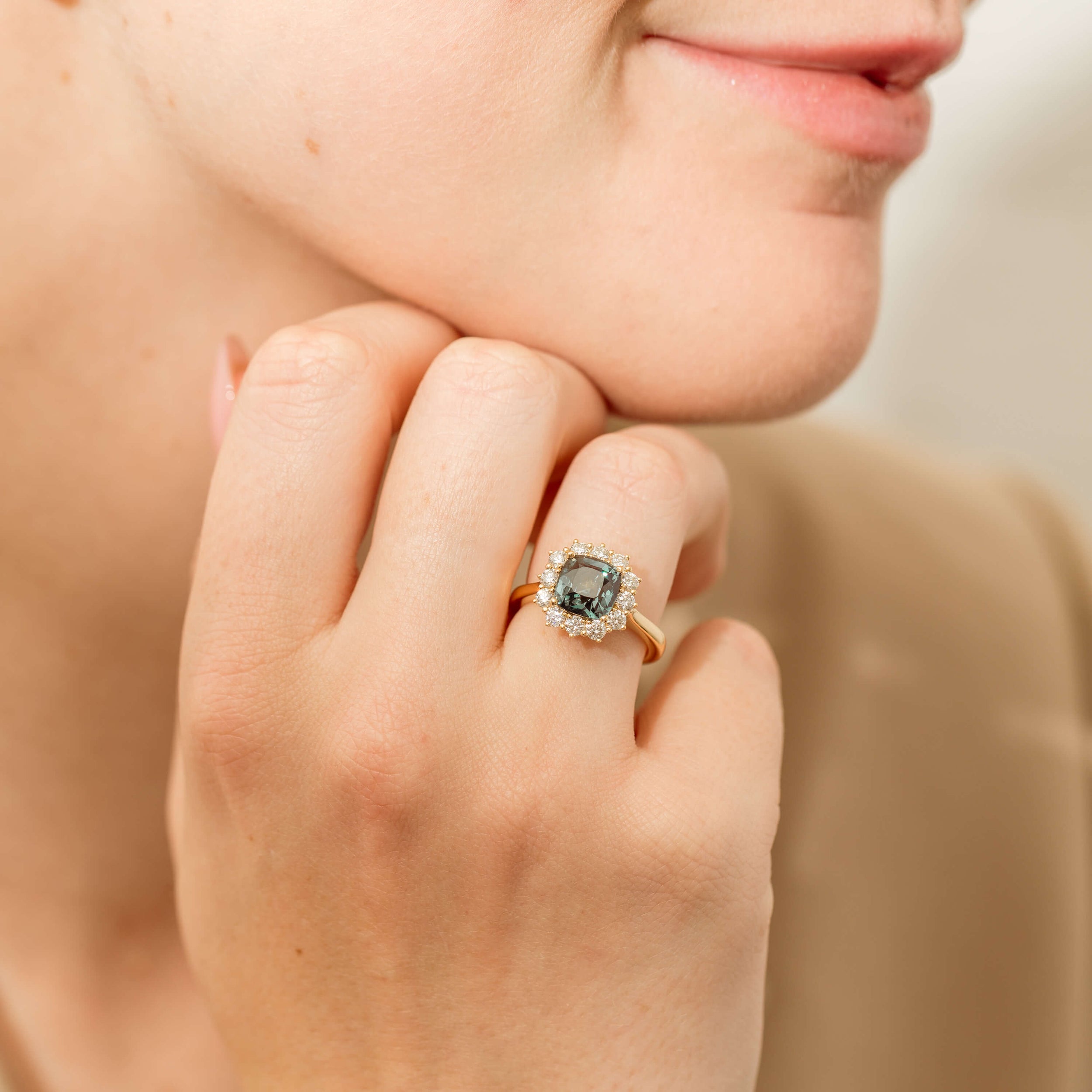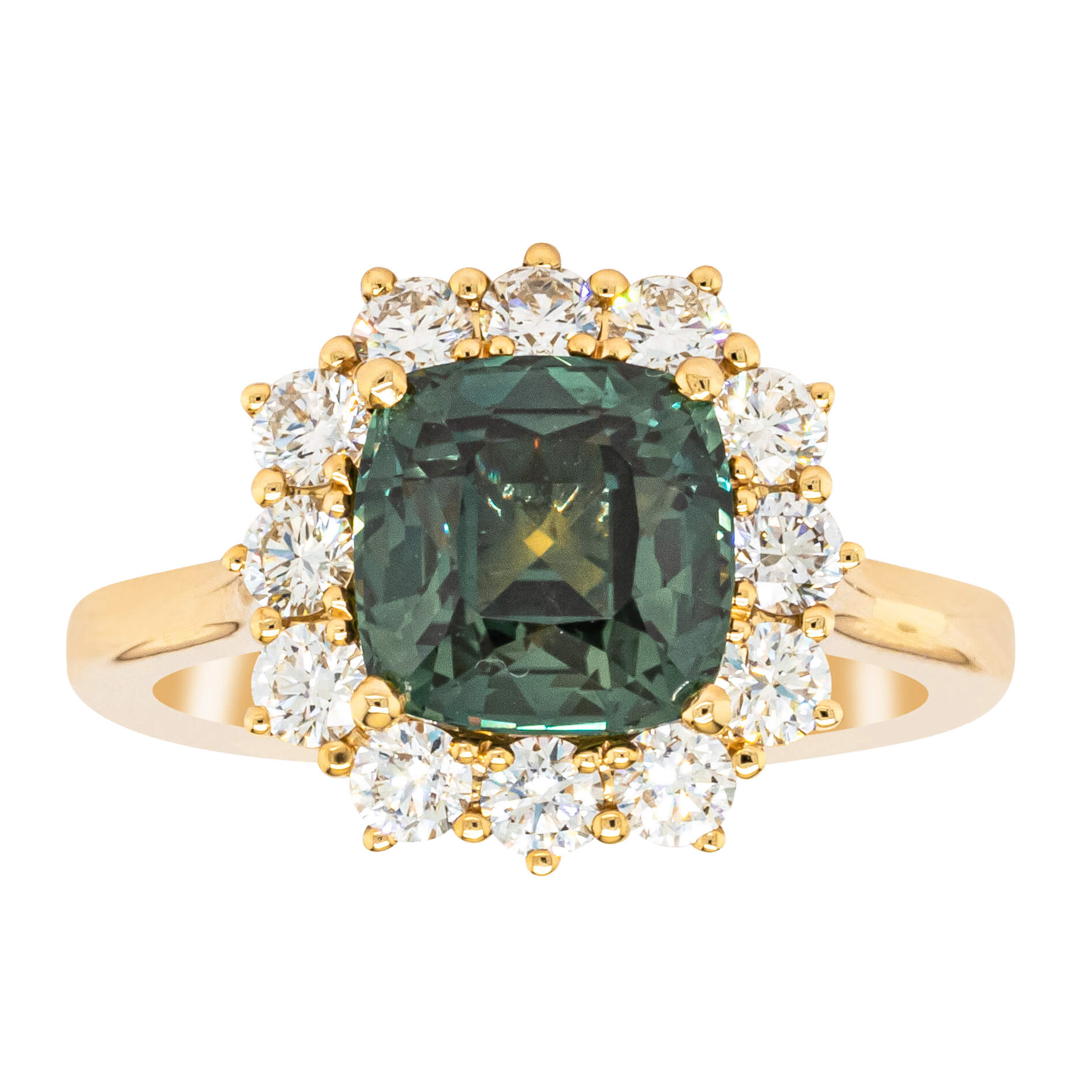 An update to a classic, this stunning cushion faceted green sapphire Belle ring from our signature 1899 collection features a demurely tapered shank and diamond detailing on the halo. The halo features twelve shimmering round brilliant cut diamonds. The beauty is in the details - this ring sparkles from every angle. This particular sapphire is from Tanzania.