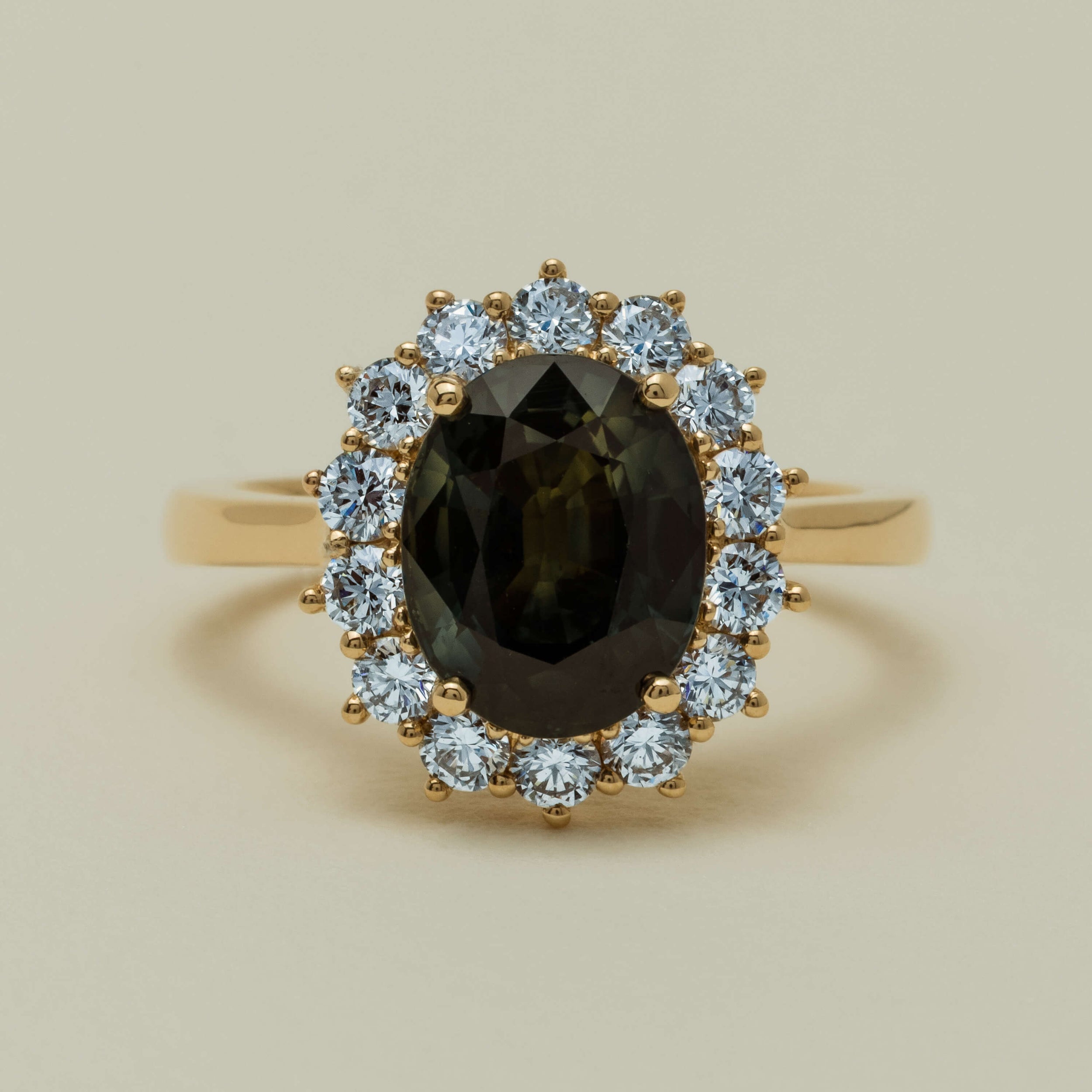 Crafted in rich 18ct yellow gold, the Belle Ring from our signature 1899 collection offers a modern twist on timeless elegance. At its centre is a striking 3.91ct oval green sapphire, beautifully framed by a halo of fourteen round brilliant cut diamonds for added brilliance and allure. The refined, tapered band enhances the sophisticated profile, while every detail—from the lustrous gemstones to the elegant silhouette—ensures this ring shines from every angle.