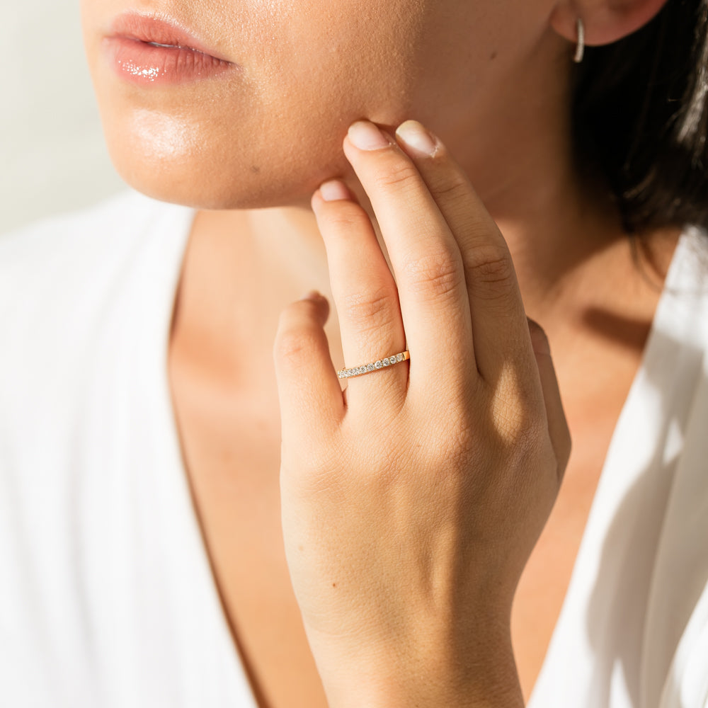 The perfect ring to complete your sparkling set! This shimmering symbol of your love and commitment features 11 shimmering round brilliant cut diamonds resting in an elegant 18ct yellow gold claw setting. Classic and dazzling, you will treasure this symbolic Bella ring forever!
