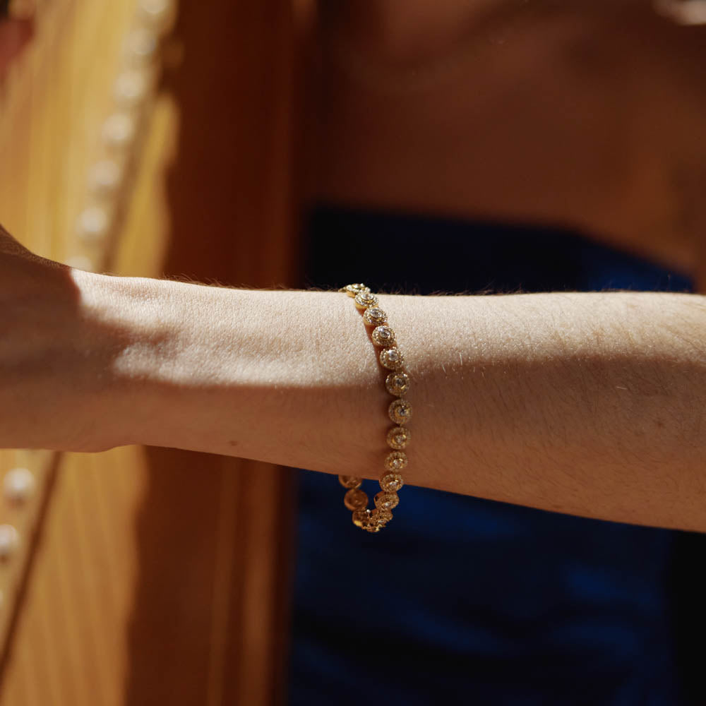 Infinite circles of sparkle imbue this stunning Isla bracelet from our signature 1899 collection with timeless elegance. Adding a romantic spin on the classic tennis bracelet, this 18ct yellow gold diamond Isla bracelet showcases stunning round brilliant cut diamonds in a halo setting. Distinct and precious in every way!