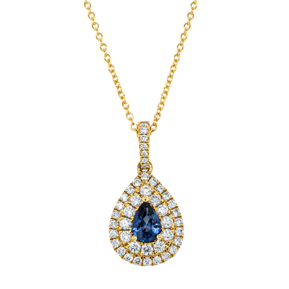This gorgeous pendant consists of a pear faceted sapphire surrounded by a double halo of round brilliant cut diamonds and resting below a tapering diamond set bail, set in 18ct yellow gold.