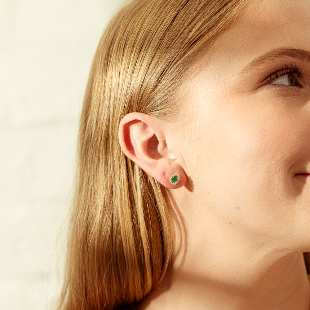 These stunning earrings are crafted from 18ct yellow gold and feature two oval faceted emeralds framed by halos of dazzling round brilliant cut diamonds. Delicately crafted, these earrings exude timeless elegance and luxurious style!
