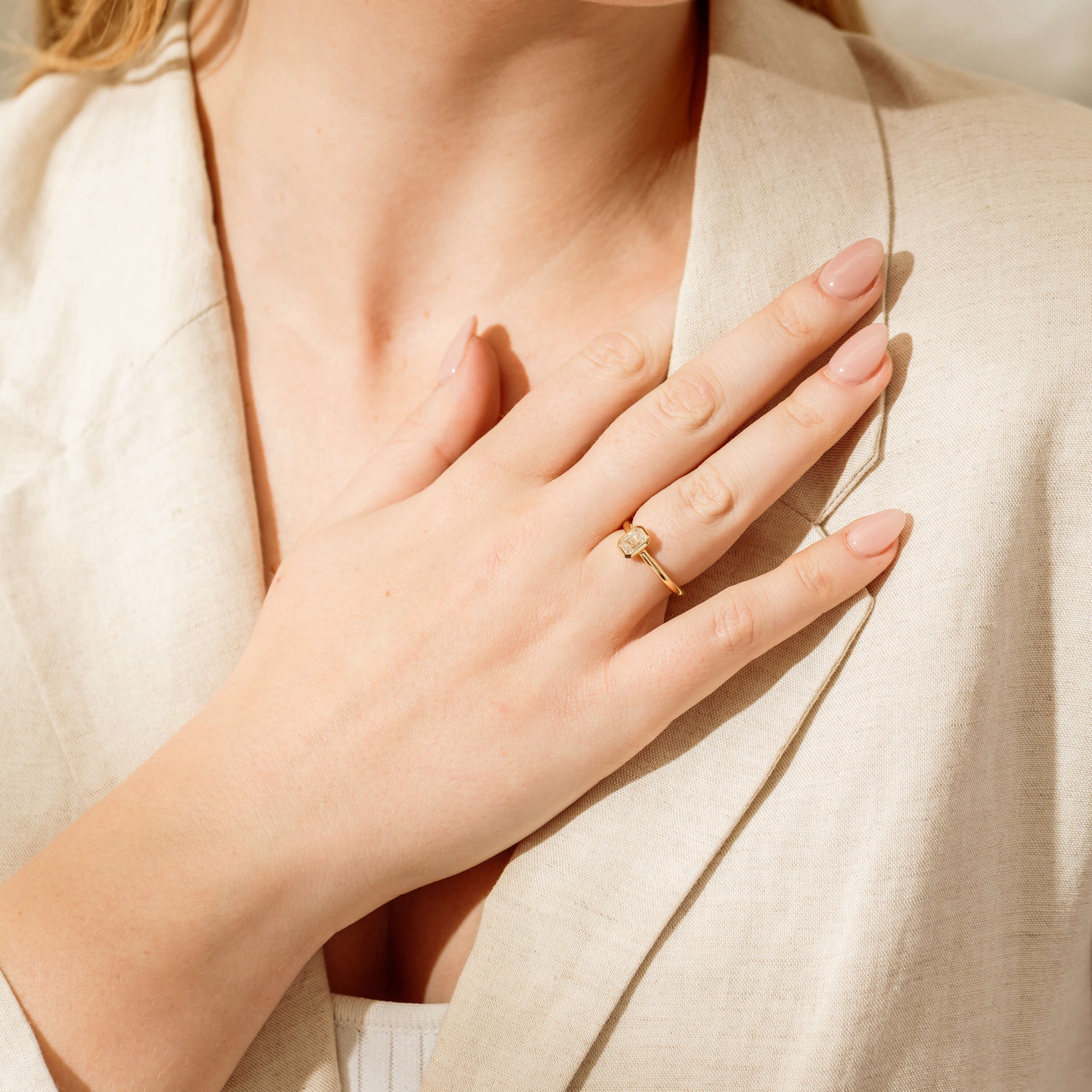 A refined, minimalist bezel frames and draws the eye to the sparkling gemstone at the centre.