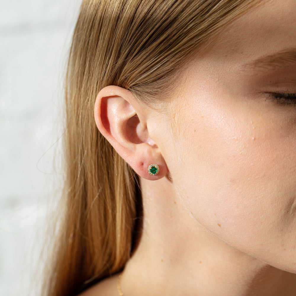 18ct yellow gold earrings featuring two strong green round cut emeralds framed by halos of dazzling white diamonds.