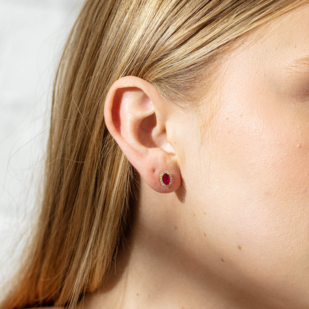 18ct yellow gold earrings featuring two oval rubies, framed by a delicate halo of sparkling round brilliant cut diamonds. Crafted with precision and great care, these timeless earrings are a luxurious addition to any jewellery collection.