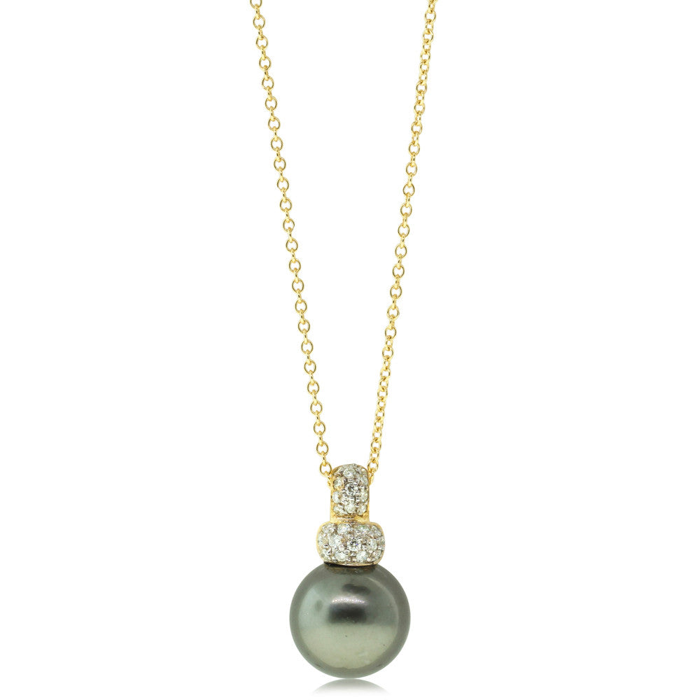Shine bright in this timeless pendant. Crafted from luxurious 18ct yellow gold, this sparkling beauty boasts a luminous black pearl resting on a glittering diamond bail. An elegant pendant that is sure to be adored.
