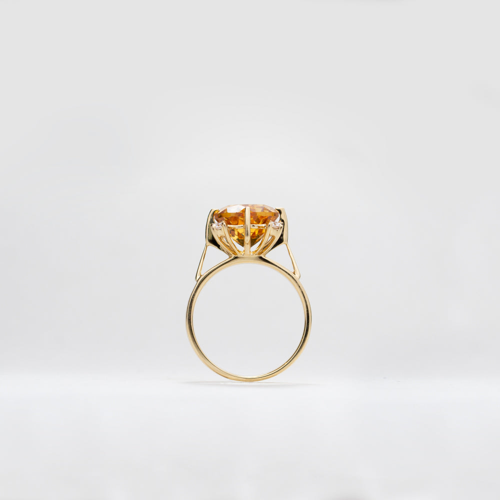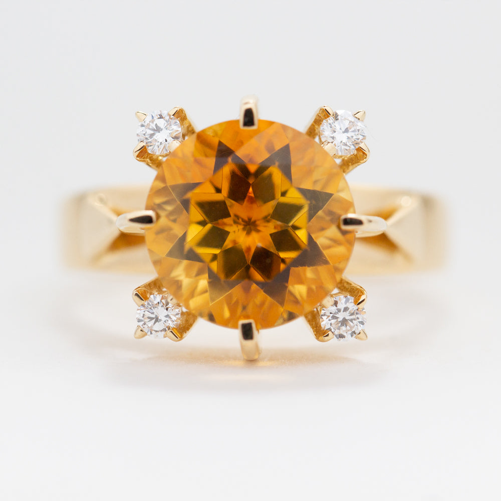 Gorgeously crafted in 18ct yellow gold, this captivating piece boasts a citrine surrounded by round brilliant cut diamonds.