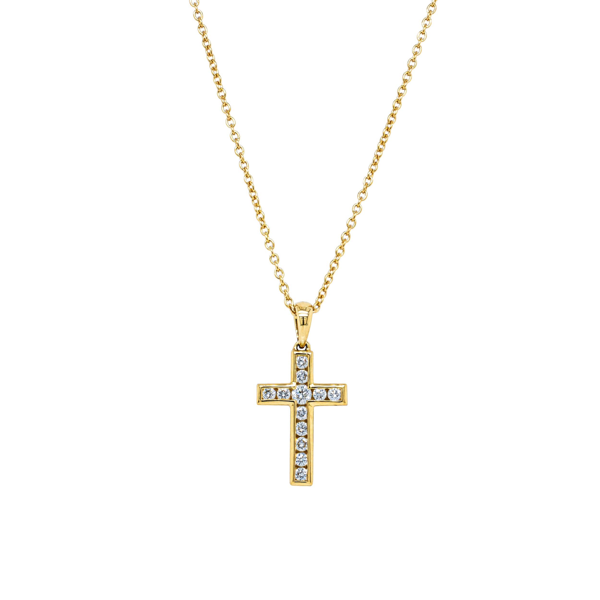Beautifully placed round brilliant cut diamonds channel-set catch the light reflecting off of this 18ct yellow gold cross pendant giving this expression of faith a heavenly glow.