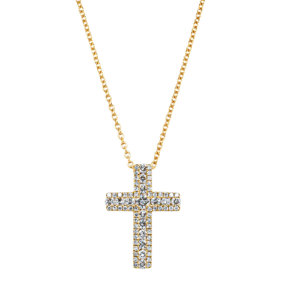 Beautifully placed diamonds catch the warm light reflecting off of this 18ct yellow gold cross pendant giving this expression of faith a heavenly glow.