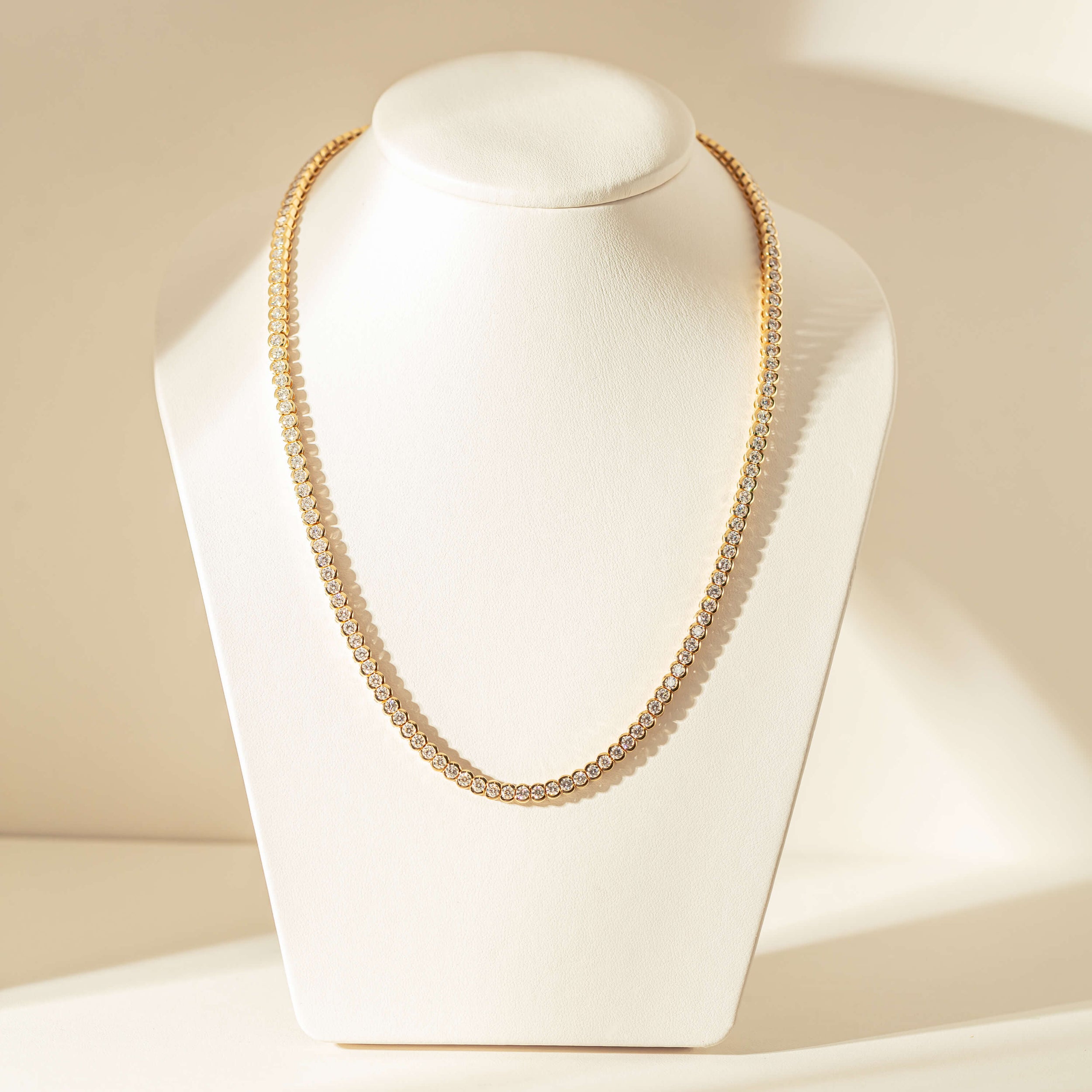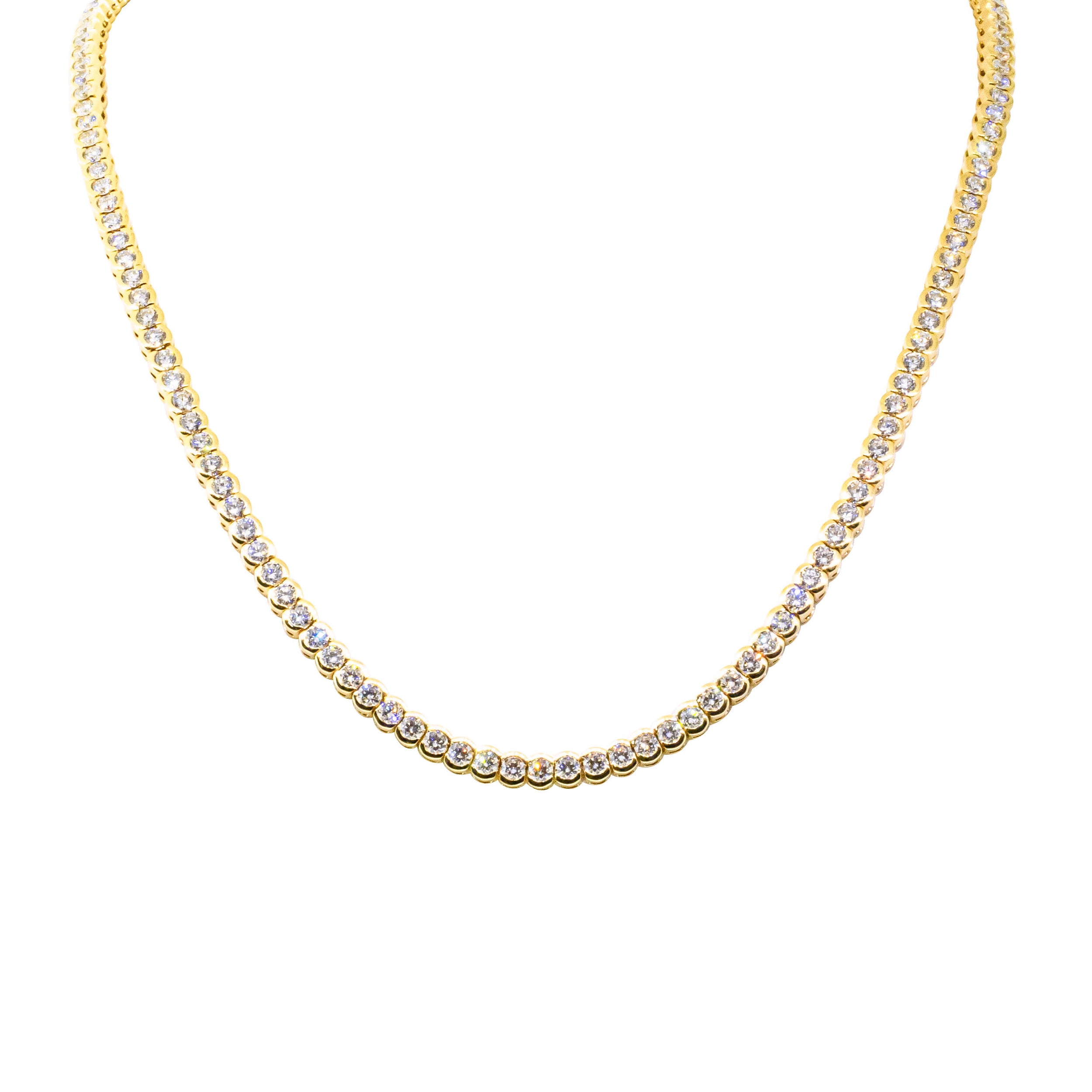 “This exceptional necklace features fine white natural diamonds, with 143 individual diamonds encased in a refined 18ct yellow gold setting which provides opulence and warmth. The thoughtful design ensures a solid yet graceful construction, allowing the piece to sit comfortably and effortlessly around the neck. The combination of exquisite craftsmanship and careful design creates a piece that offers both remarkable beauty and incredible wearability.” - Joseph Tattersfield