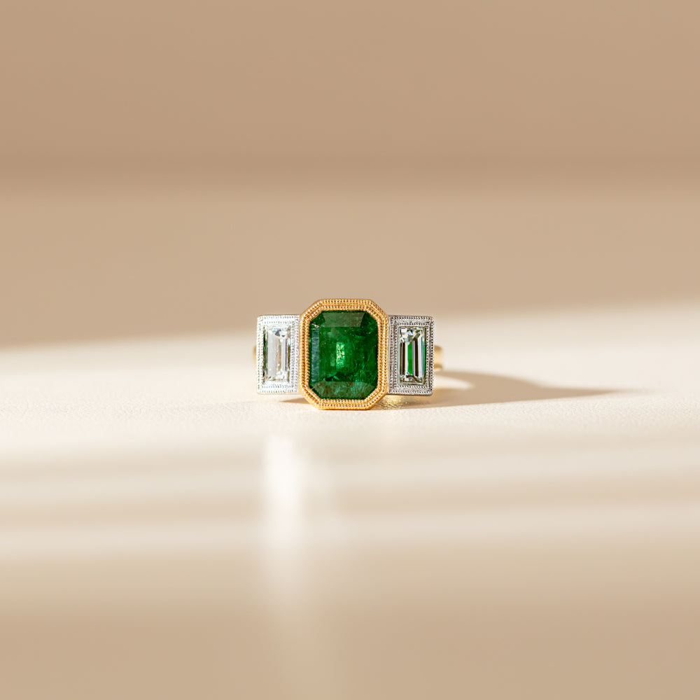 This Art Deco inspired ring features a significant emerald, noted for its desirable green hue and intensity. The emerald is complemented by generous shoulder baguette diamonds of fine quality. The ring showcases meticulous beaded finishes around the gemstones and an elegantly detailed side profile.